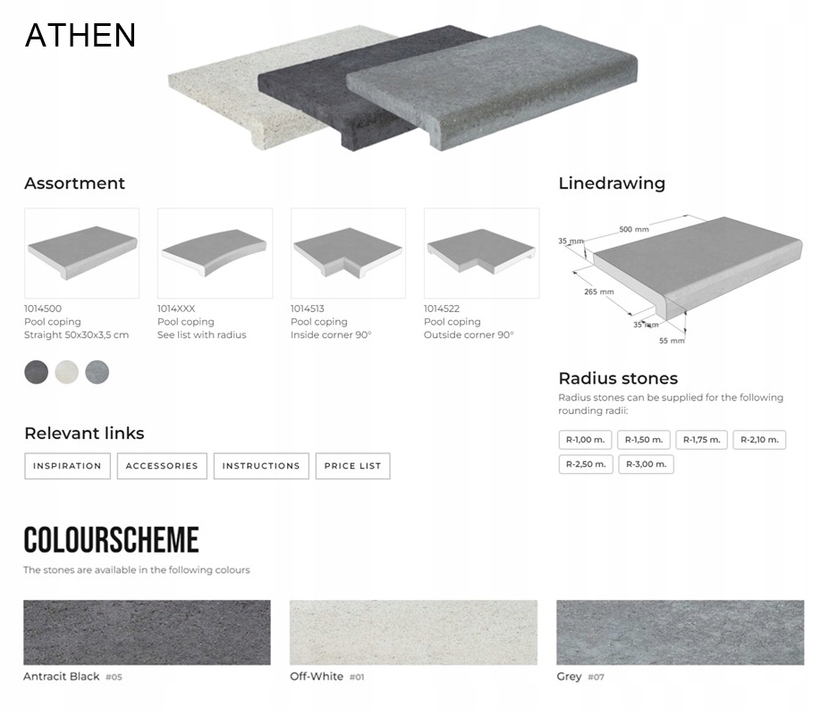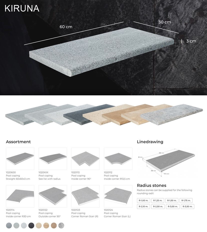 Элегантные края камней с гармоничным дизайном и очень приятной на ощупь поверхностью. Камни серии Kiruna доступны в широком диапазоне цветов, которые подойдут к любому интерьеру бассейна. Изящные минималистичные изгибы обеспечивают удобный захват, когда вы цепляетесь за край или бездельничаете в жару, опустив ноги в воду. В серию Kiruna входят прямые камни, а также большой выбор закругленных камней и различных типов углов.