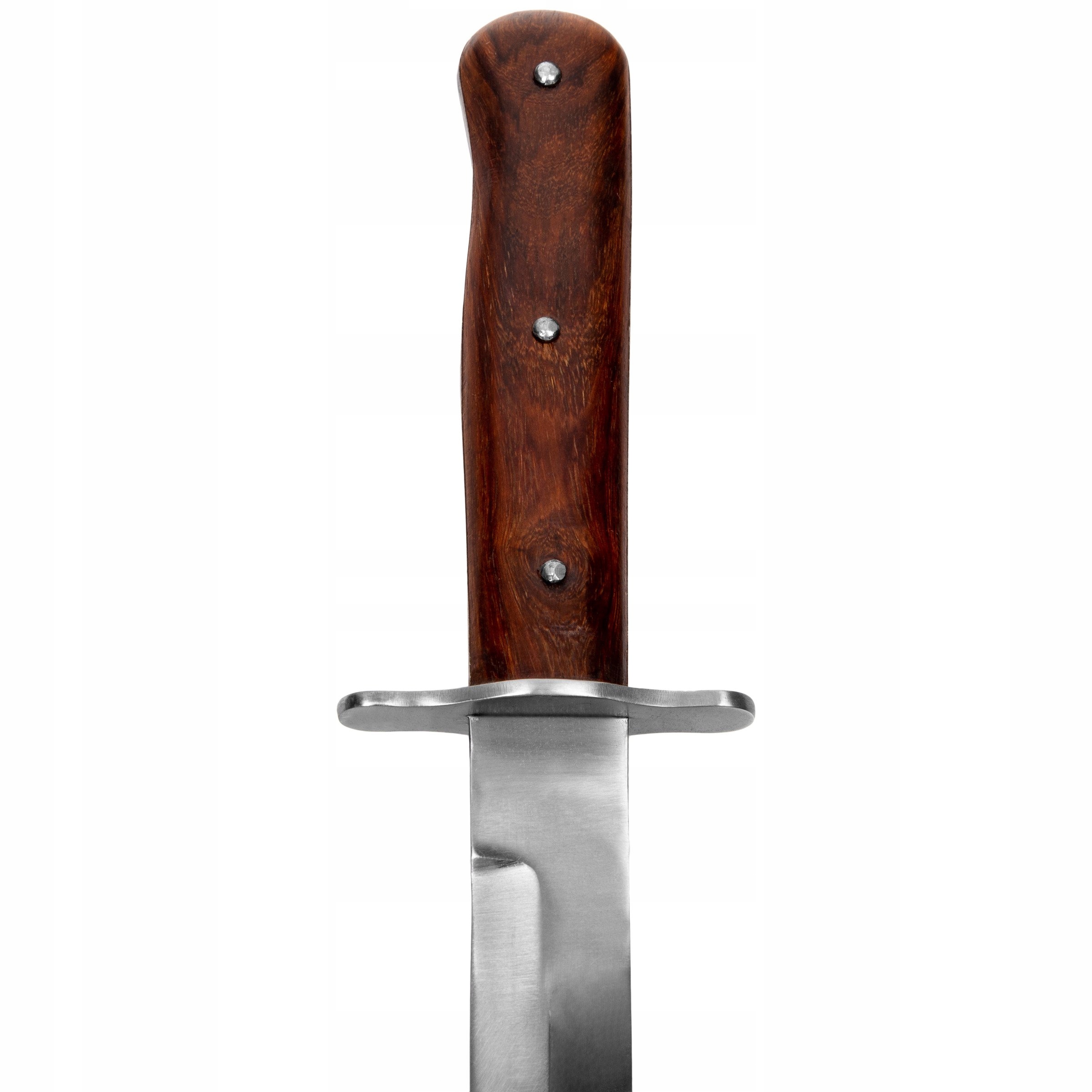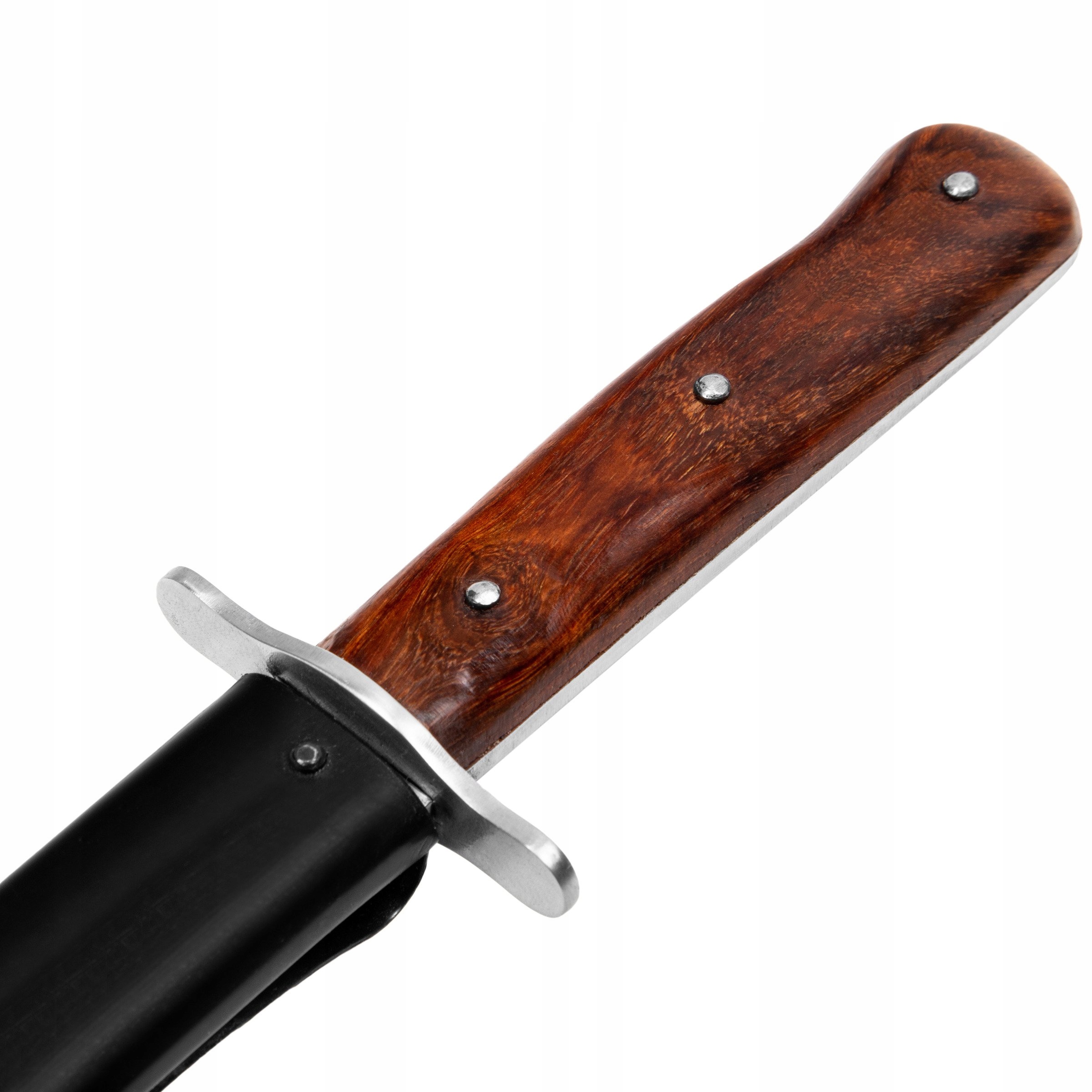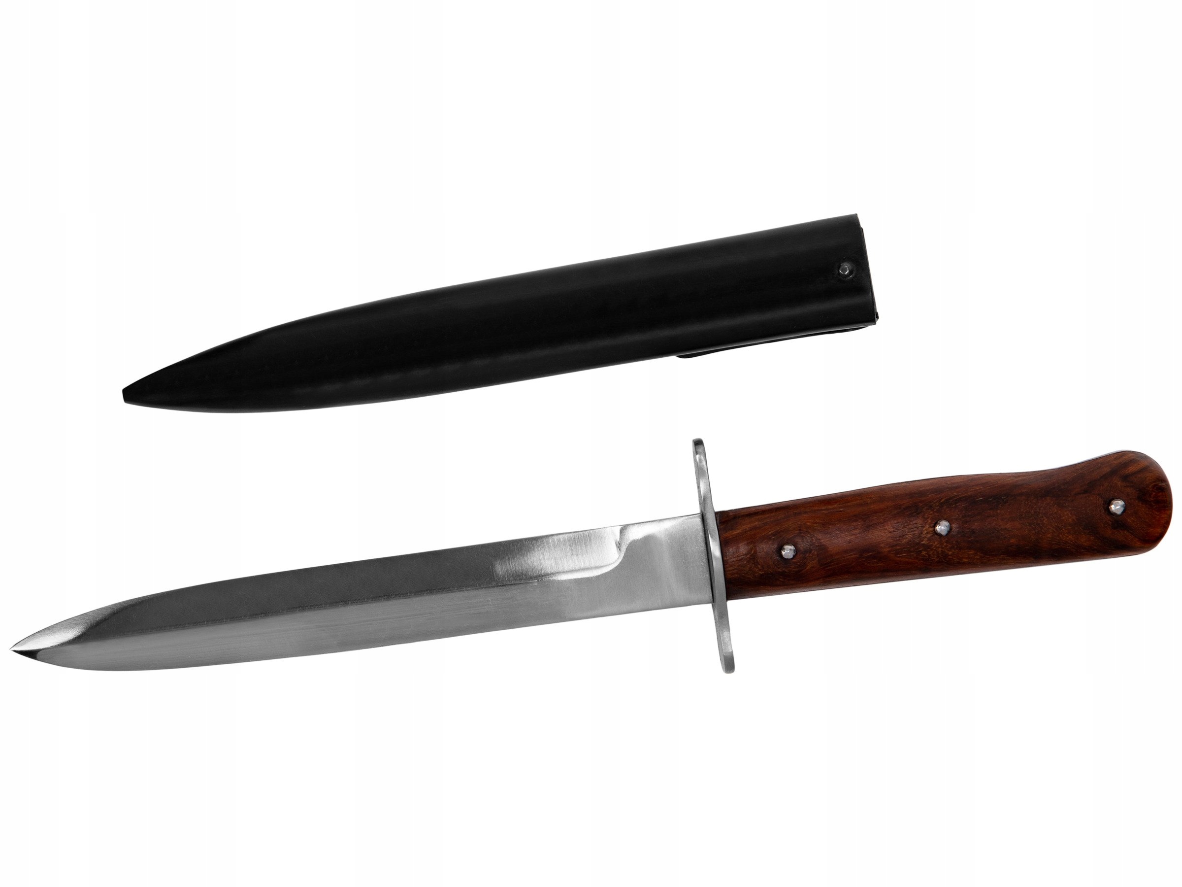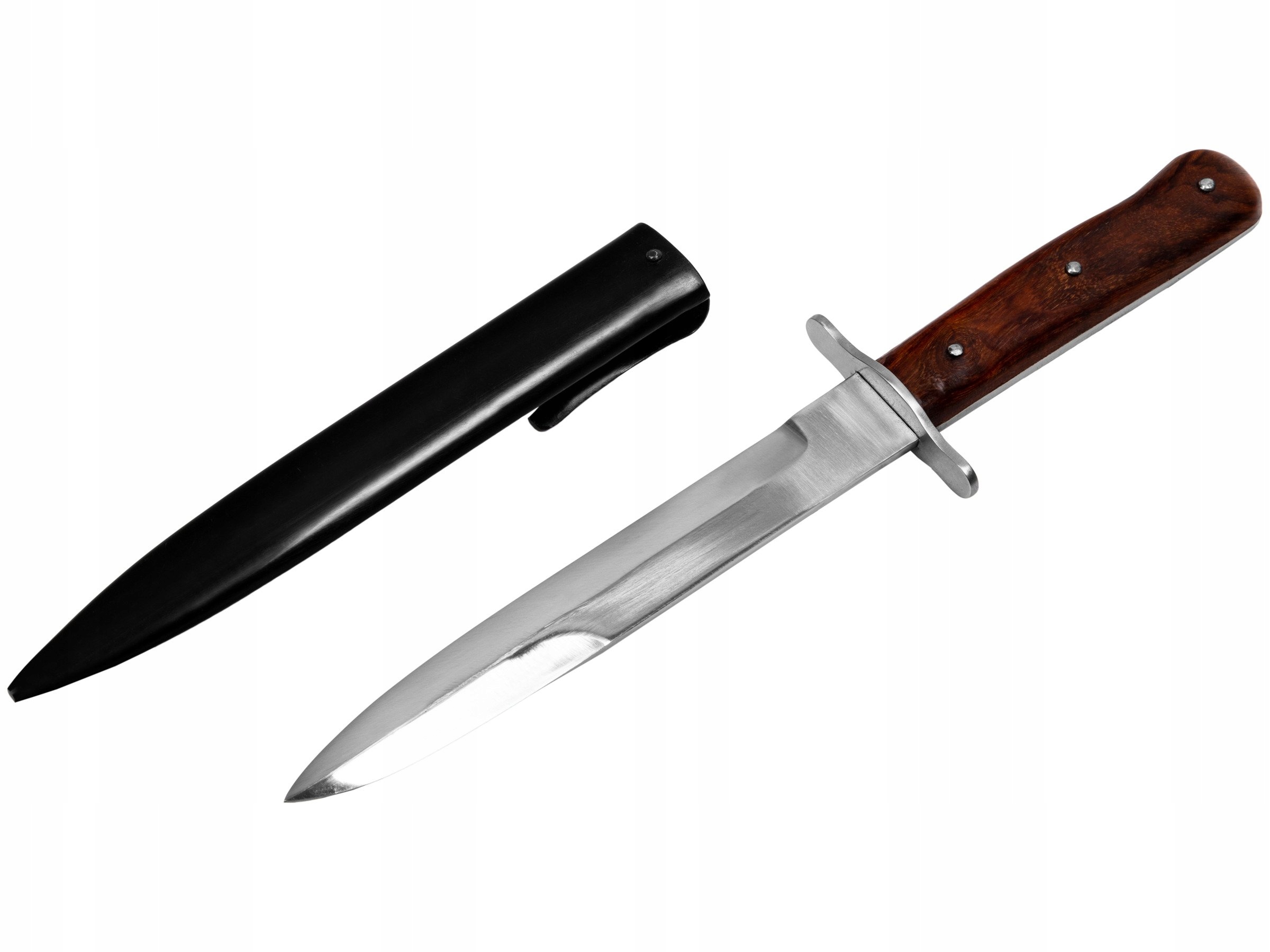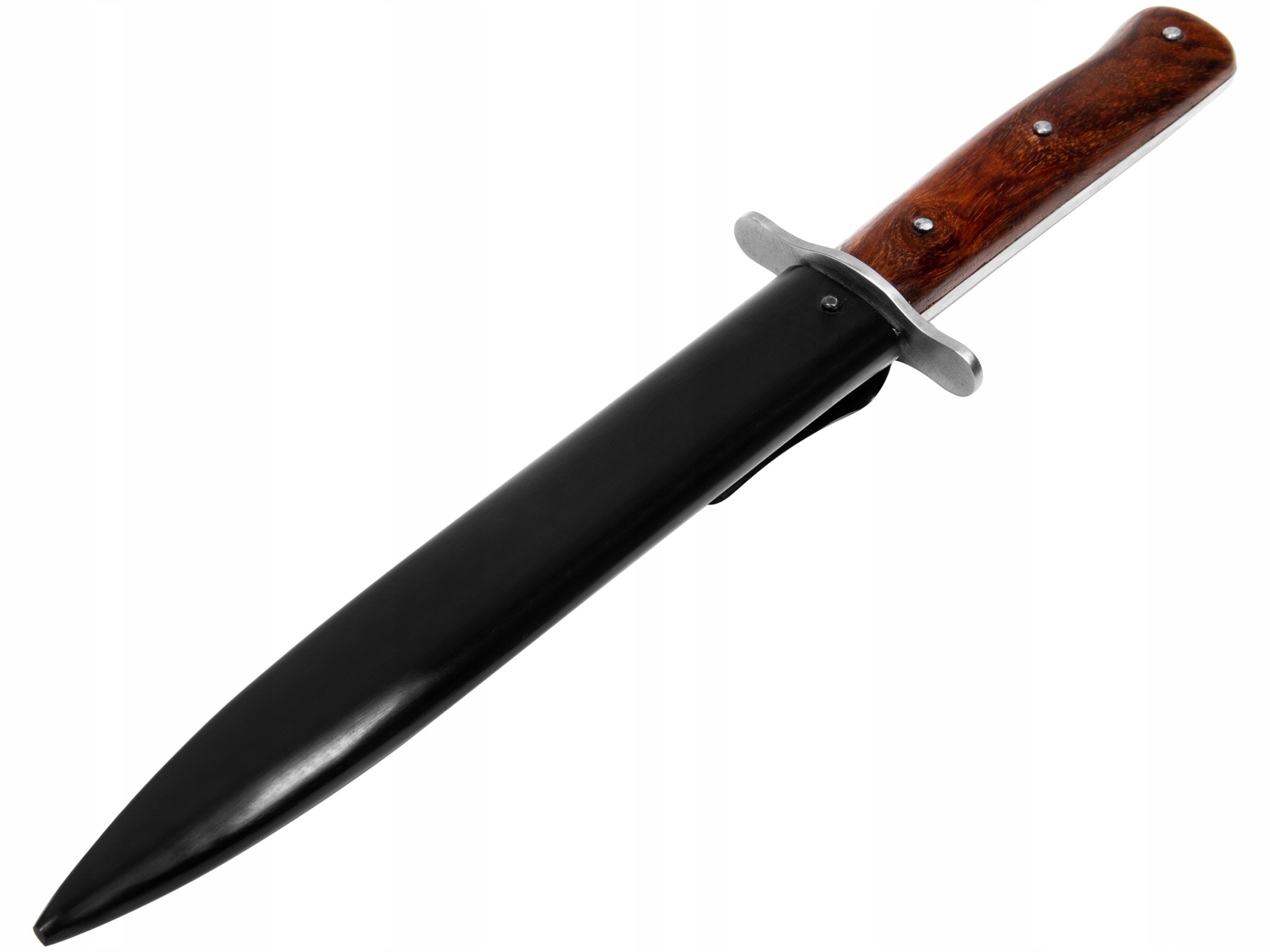 Прекрасная копия немецкого пехотного штурмового ножа времен Второй мировой войны - Infanteriemesser 42. Очень качественная копия, клинок изготовлен из высокоуглеродистой стали, а обшивка - из дерева. Длина клинка 18 см, общая длина ножа 28,5 см. В комплект также входят ножны для ножа.