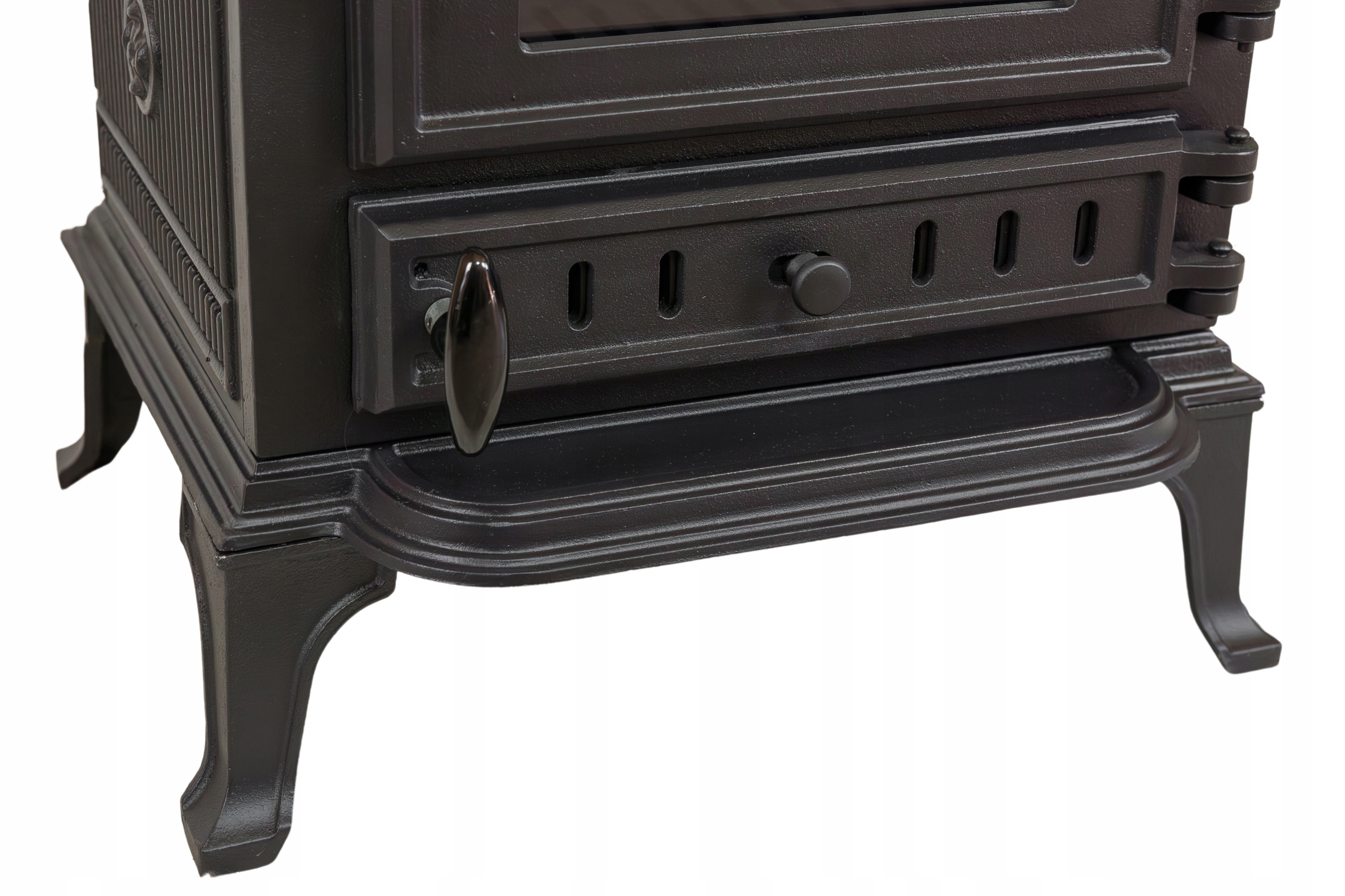 Печь имеет толстые чугунные стенки из отливки высочайшего качества, которые долго сохраняют тепло и отдают его еще долго после того, как оно потухнет в печи, печь имеет чугунную плиту решетка, обеспечивающая эффективную циркуляцию воздуха и беспроблемный перенос золы. Печь оснащена чугунной нагревательной плитой, что позволяет использовать ее и для приготовления пищи. Чугунная каминная дверца имеет термостойкое керамическое стекло, благодаря которому мы можем контролировать количество топлива. Чугунная дверца оснащена прочной стальной ручкой и уплотнена техническим герметиком, что гарантирует герметичность и безопасность.