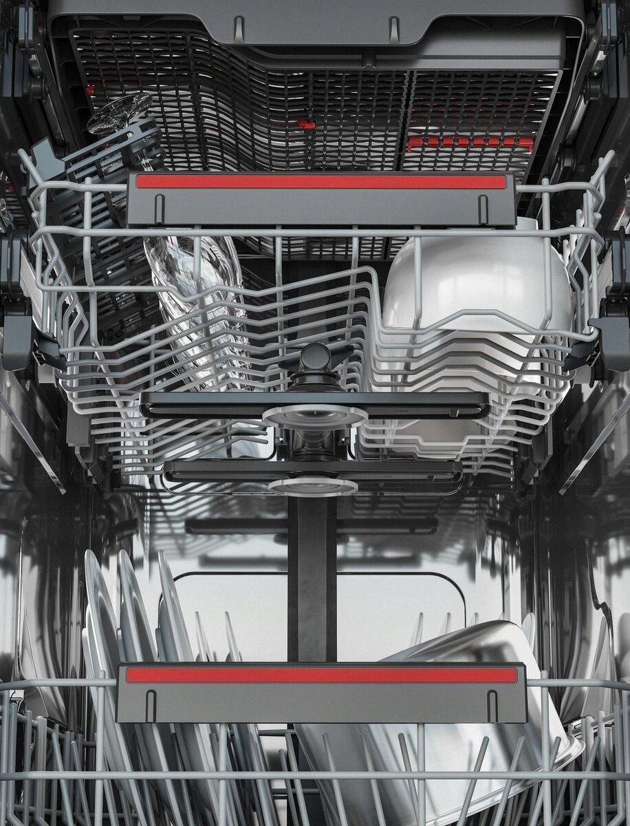 Два вращающихся разбрызгивателя обеспечивают равномерное распределение воды по всей камере и достижение каждого уголка посудомоечной машины. Благодаря этому вся посуда идеально чистая.