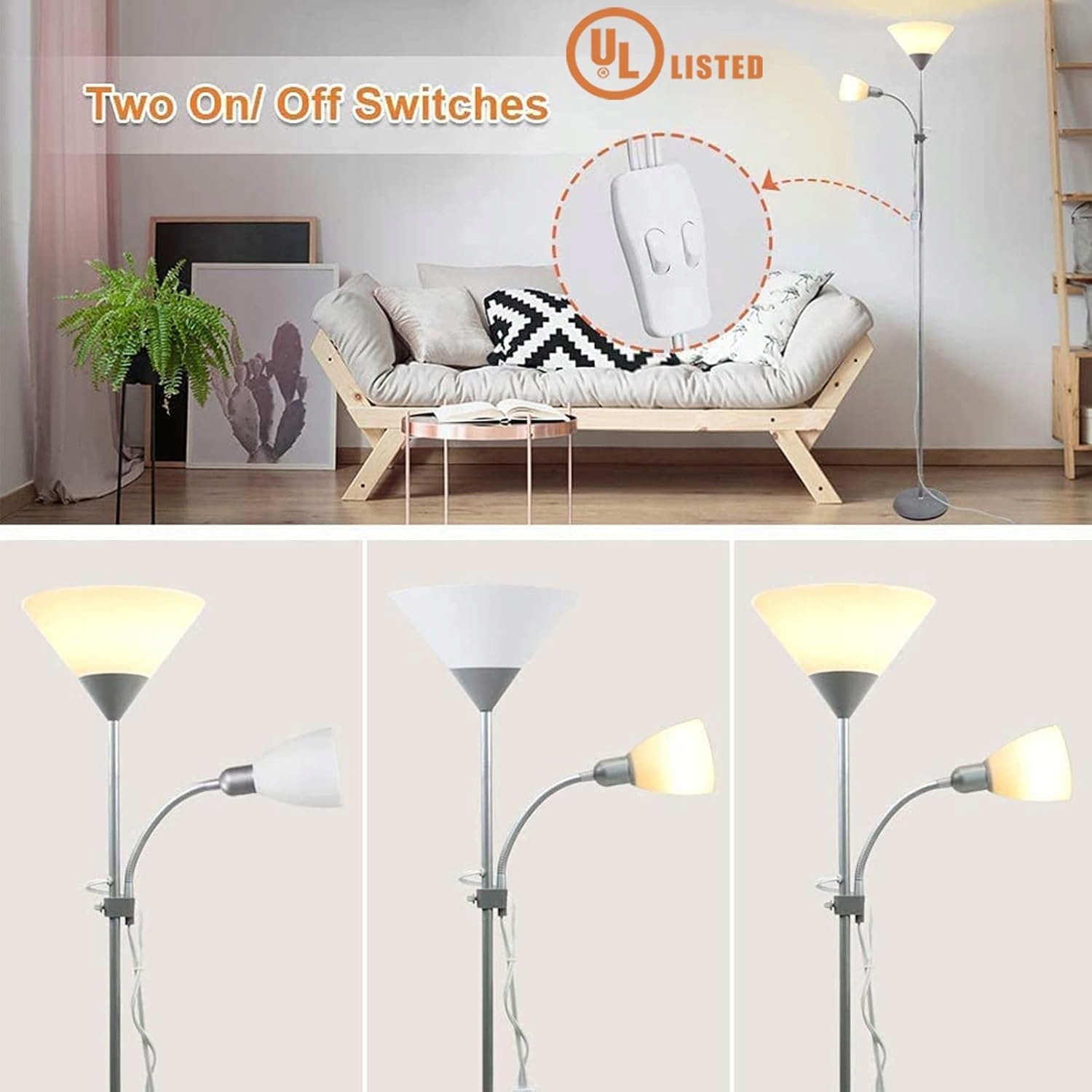 Этот торшер имеет две головки лампы, верхний светильник можно использовать в качестве торшера для освещения комнаты, а боковой свет можно использовать в качестве настольной лампы для чтения или учеба.