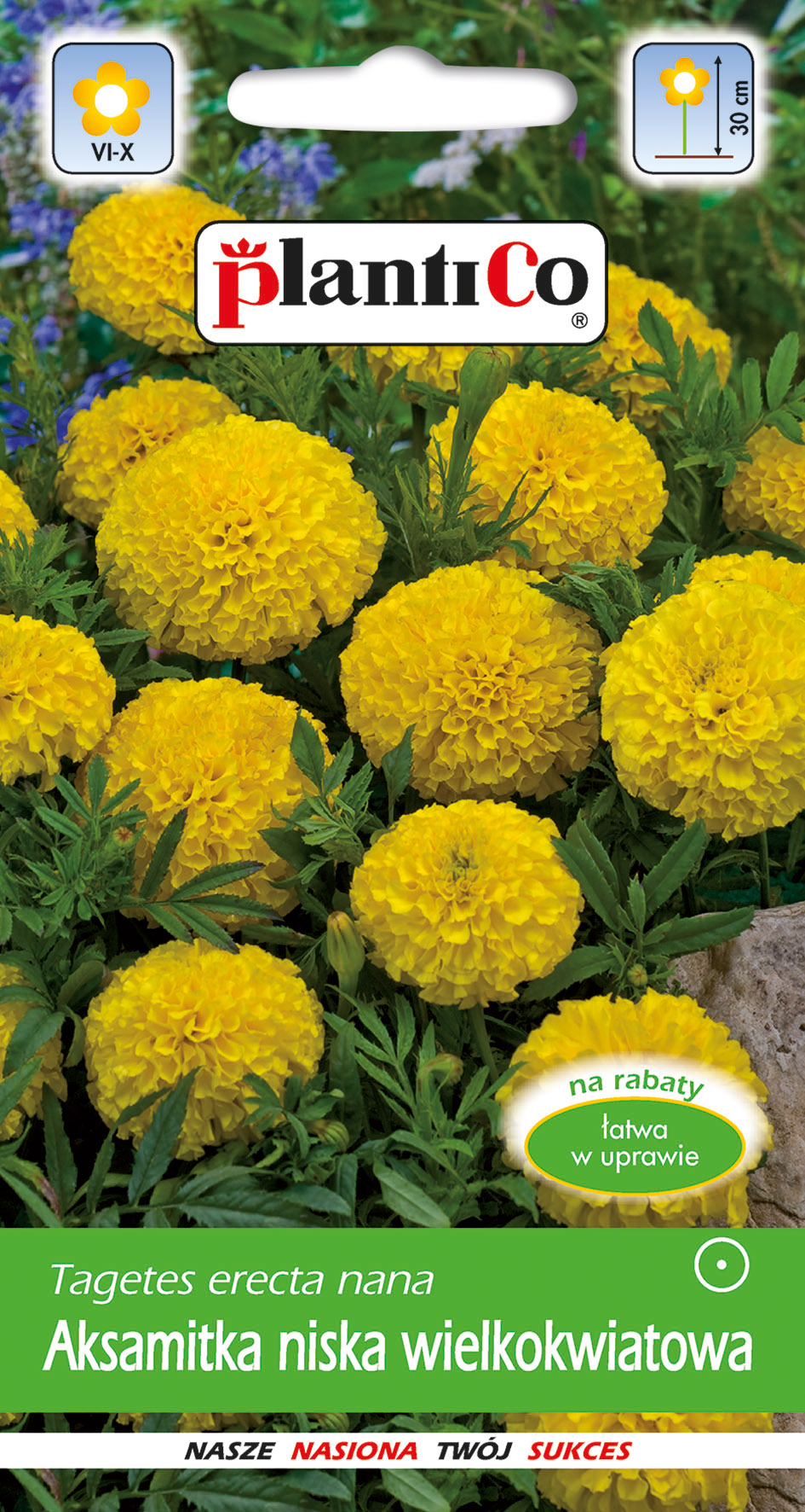 Бархаты – одно из самых известных однолетних растений. Цветки крупные, обильно цветущие до заморозков. Зацветает через 12 недель после посадки. Растение рекомендуется для клумб, клумб, контейнеров и балконных ящиков. Очень хорошо переносит нехватку воды. Легко выращивается, нетребователен и устойчив к неблагоприятным условиям. Любит солнечное место или полутень.