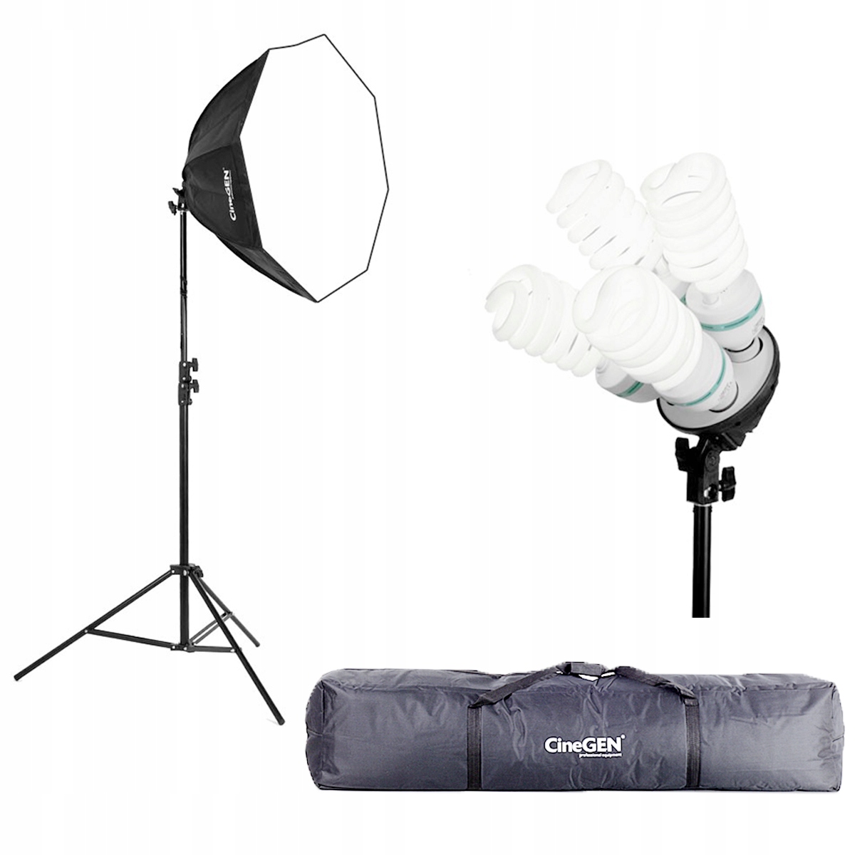 светильник освещения состоит из четырехкратной рамы для лампочек E27 и чаши для софтбокса (отражающая и диффузионная ткань и натяжения). Форма навеса была выбрана так, чтобы диффузионная ткань достигла максимального количества света. Внутри он закончен с серебряной, металлизованной отражающей поверхностью - он предотвращает излучение света в сторону и в сторону и отражает их в желаемом направлении - диффузионной ткани. Это означает, что максимальное количество света переходит к сфотографированному объекту. Снаружи Softbox - Matt Black, благодаря которой он не отражает свет от других ламп. Это обеспечивает регулирование питания прыжков, включив/выключить лампочки (два переключателя): 0%-50%-100%. Набор прикреплен к освещению штатива с помощью ручки, которая обеспечивает любую регулировку угла наклона