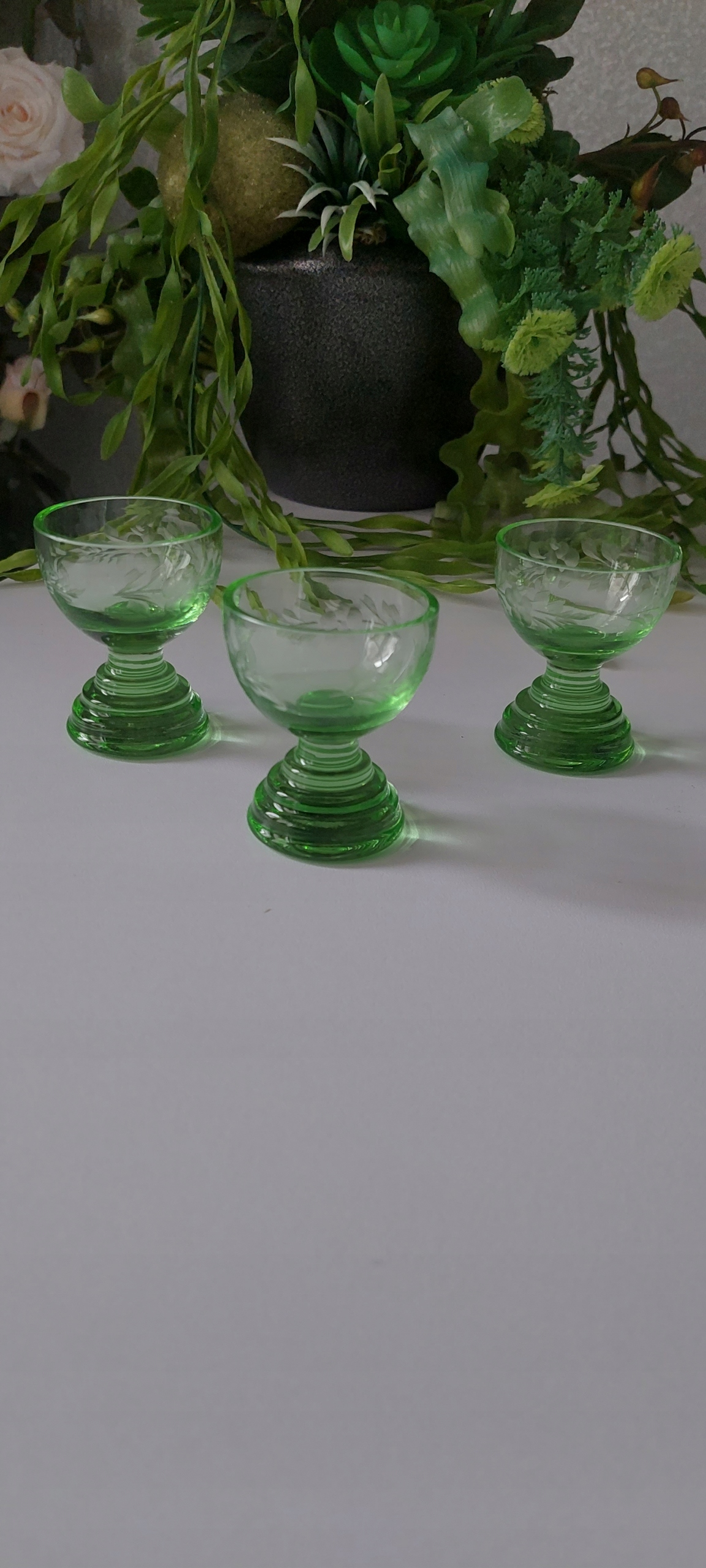 Три стакана в очень хорошем состоянии, размеры: высота 6 см, диаметр чаши 5 см.