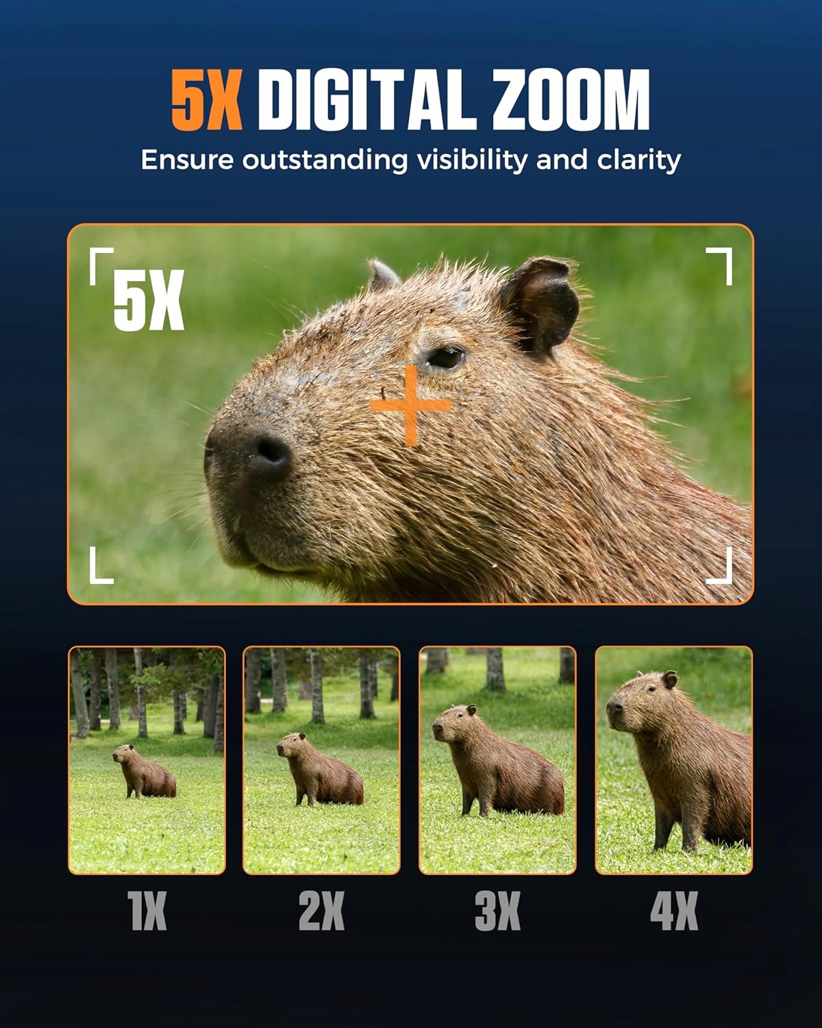 4-дюймовый (10 см) дисплей HD 1080P в сочетании с яркой диафрагмой f/1,0 (вдвое больше света, попадающего в стандартный бинокль ночного видения) и 5-кратным цифровым зумом обеспечивает чрезвычайно четкое изображение и видео.