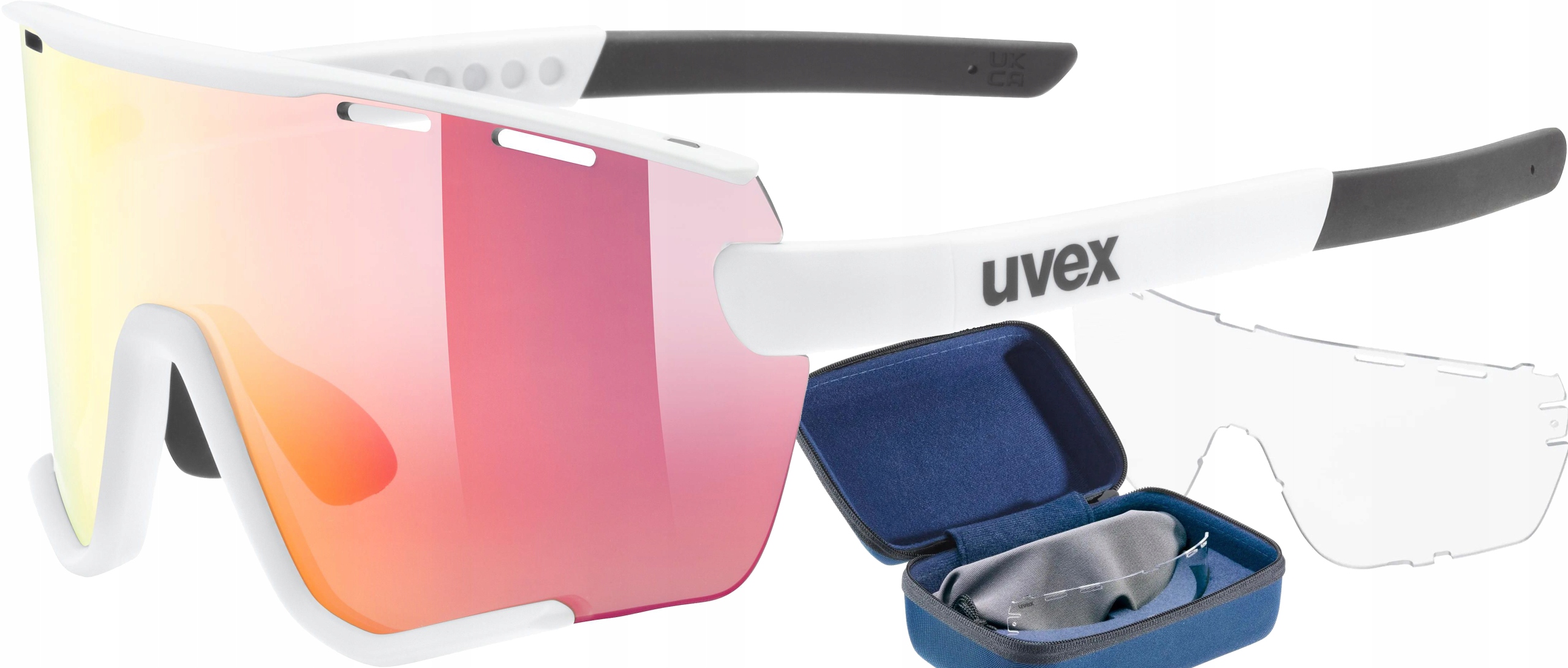 Белые спортивные солнцезащитные очки с красными зеркальными линзами категории S2 со светопропусканием 18-80% + сменные кошачьи линзы. S0