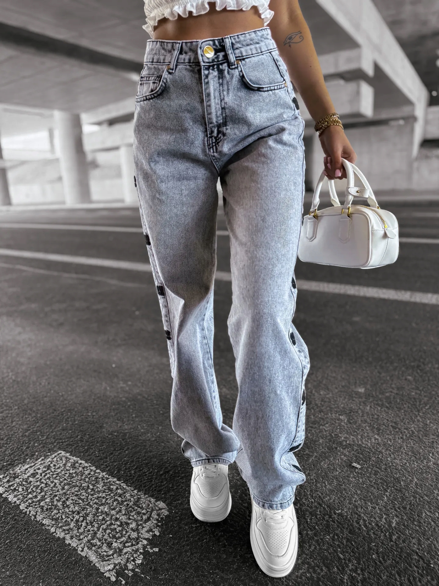Повседневные джинсовые брюки. Изготовлен из хлопкового материала. Карманы спереди и сзади. Зарегистрированная кнопка. Кожаная нашивка на задней стороне изделия с логотипом бренда OLAVOGA. Ноги нежные расширен вниз. Спереди украшение - рваный вырез, возле карманов. Продукт имеет ссадины.