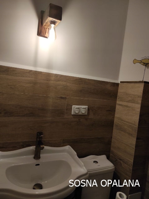 Настенная лампа, изготовленная из сосновой луча 10x10 см, и платы размером 11x20 см. Луч урегулирован E27.