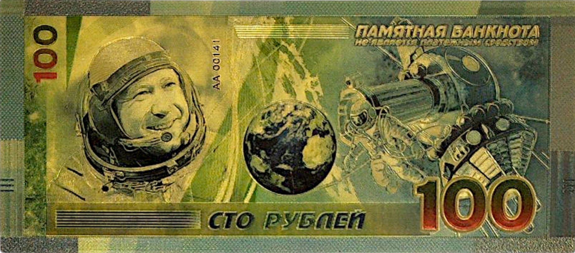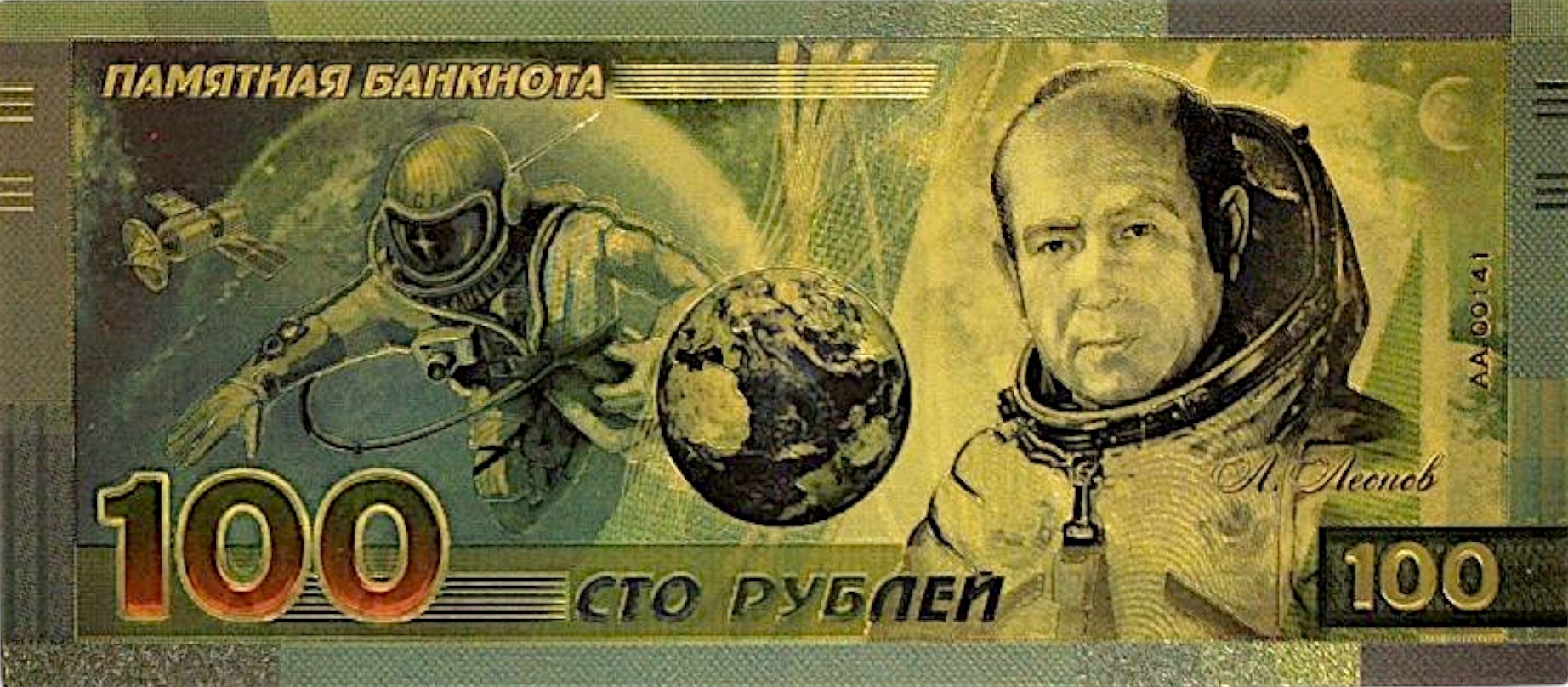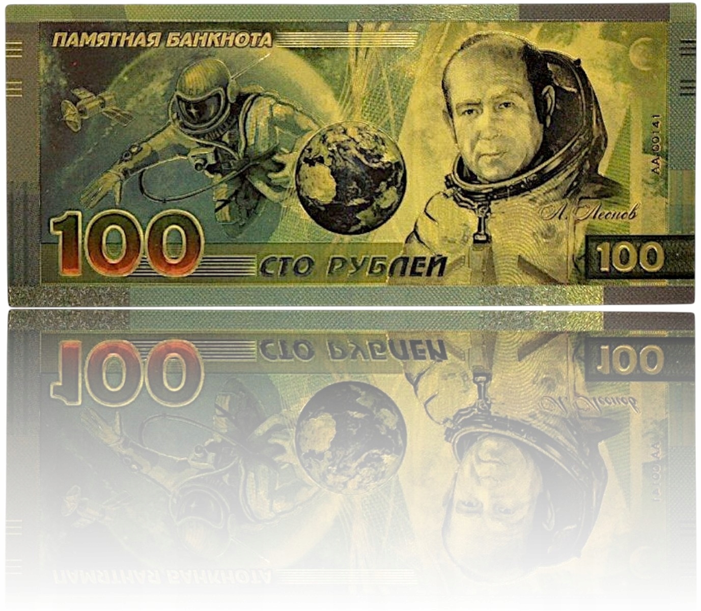 АЛЕКСЕЙ ЛЕОНОВ Необычная позолоченная коллекционная банкнота 24 карата ПВХ 100 руб.