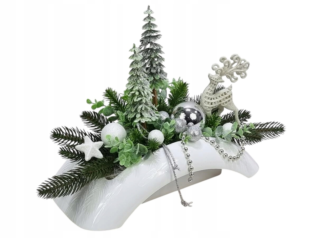 Одно из наших самых популярных и любимых новогодних украшений для кладбища уже несколько лет. Рождественское украшение с елками, игрушками и оленями. Композиция в прочной белой икебане. Все выглядит великолепно.
