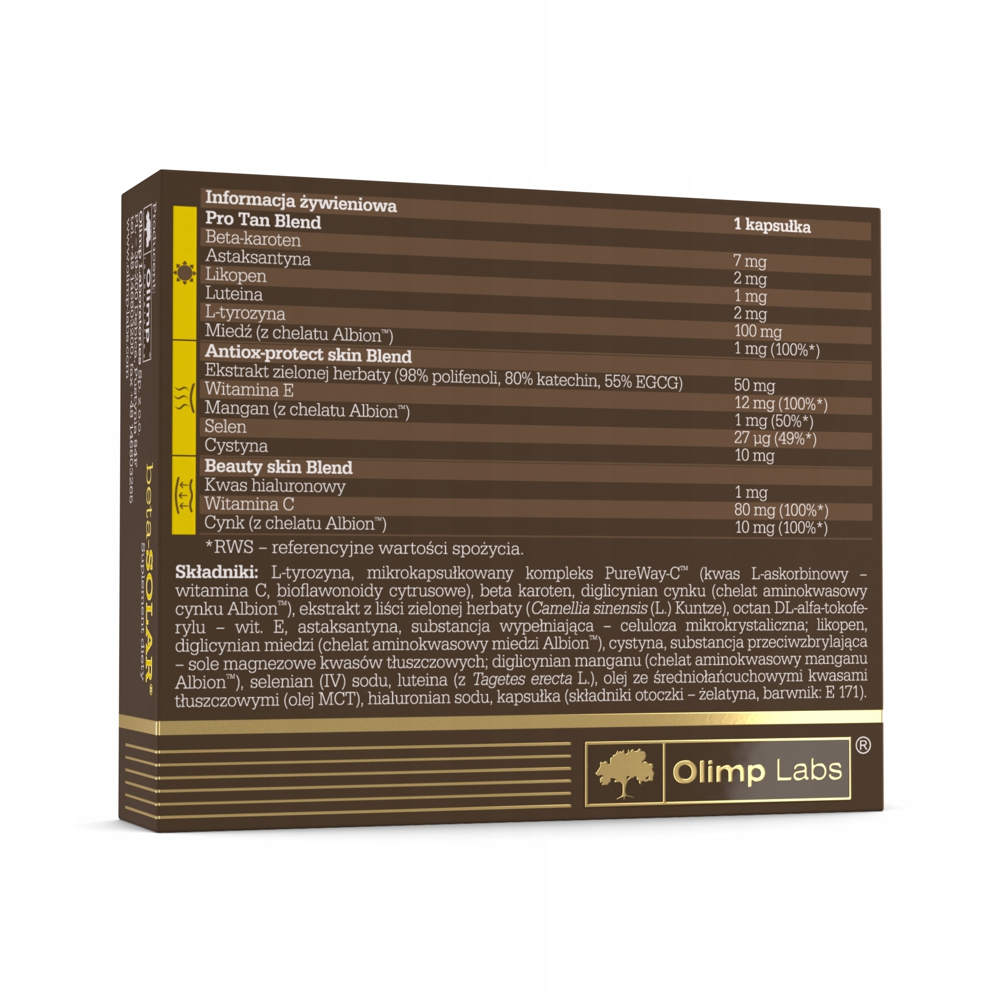 Beta -Solar® - -это пищевая добавка, которая является композицией активных ингредиентов, объединенных в трех формулах. Pro Tan Blend содержит, среди прочих, что помогает поддерживать надлежащую пигментацию кожи. Смесь кожи, защищенной от антиок, представляет собой смесь натуральных антиоксидантов: витамин Е, селена и марганца, а также экстракт зеленого чая, которые способствуют укреплению защиты организма от окислительного стресса. Витамин С и цинк, которые являются ингредиентами смешивания кожи красоты, помогают поддерживать хорошее состояние кожи.