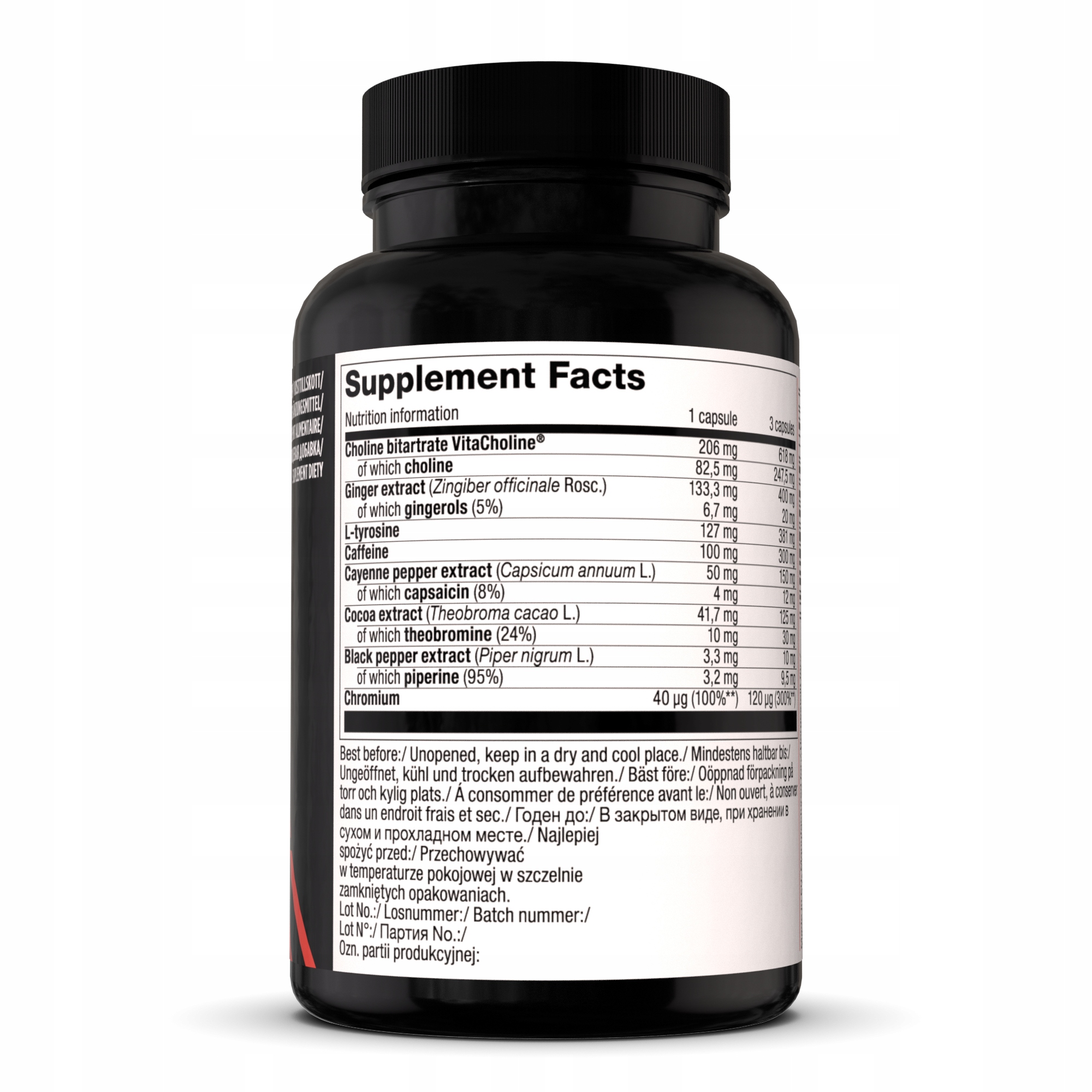 Состав: 21,2% битартрат холина VitaCholine® - холин, наполнитель - микрокристаллическая целлюлоза; 13,7% экстракт корня имбиря (Zingiber officinale Rosc.), 13,1% L-тирозин, 10,3% кофеин, 5,2% экстракт плодов кайенского перца (Capsicum annuum L.), 4,3% экстракт семян какао (Theobroma cacao L.), предотвращающий слеживание. агенты – магниевые соли жирных кислот, диоксид кремния; 0,3% экстракт плодов черного перца (Piper nigrum L.), 0,02% хлорид хрома(III) - хром, капсула (желатин, краситель: Е 171).