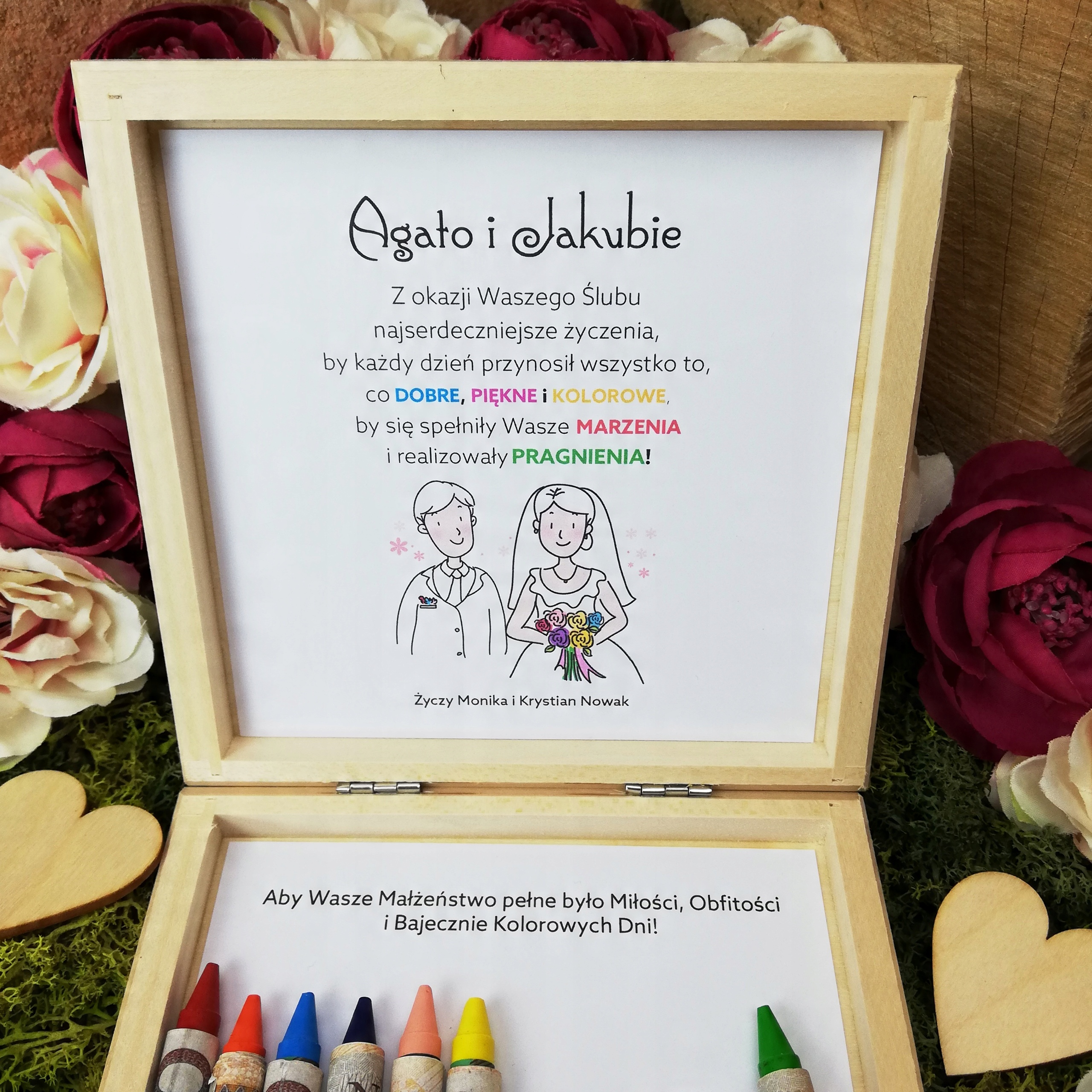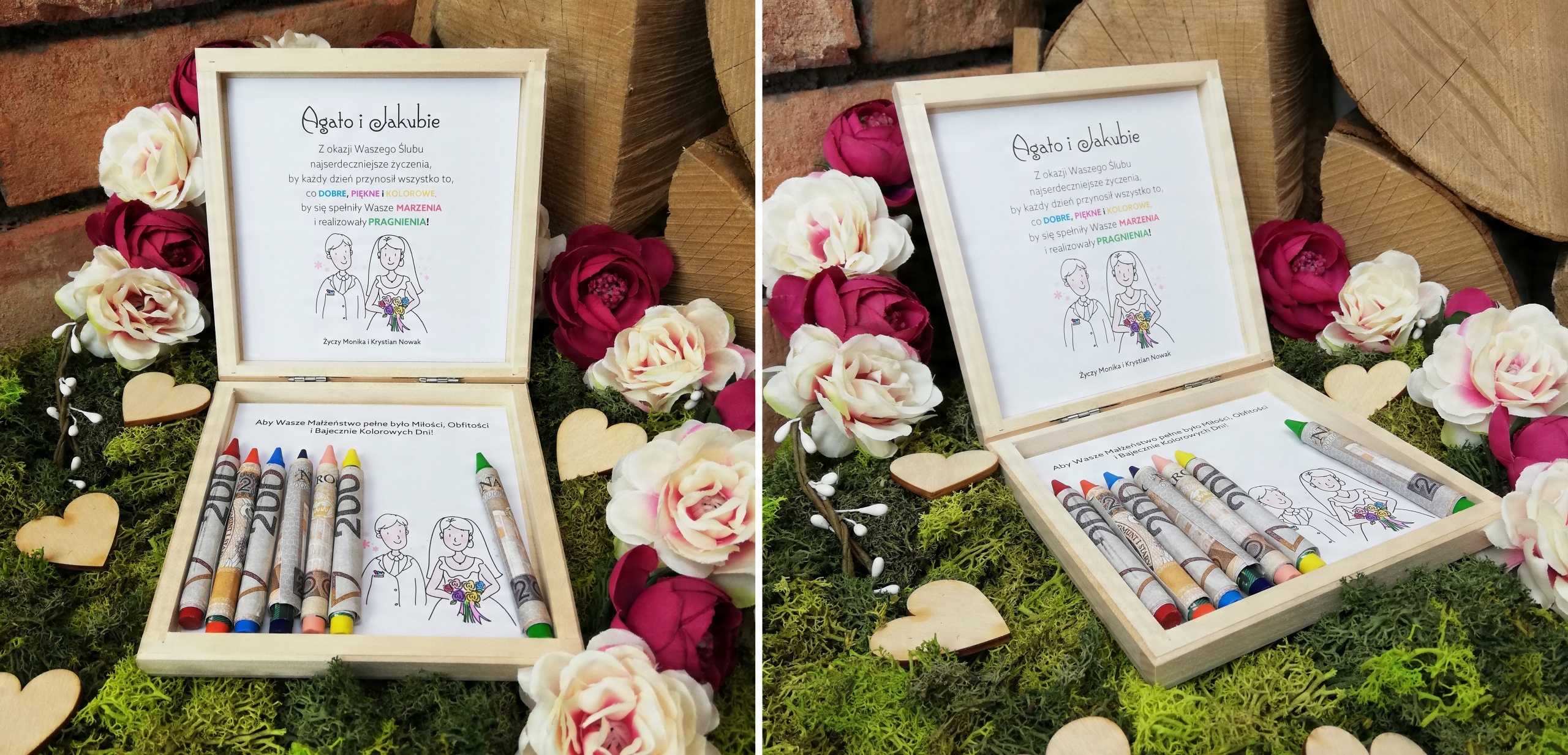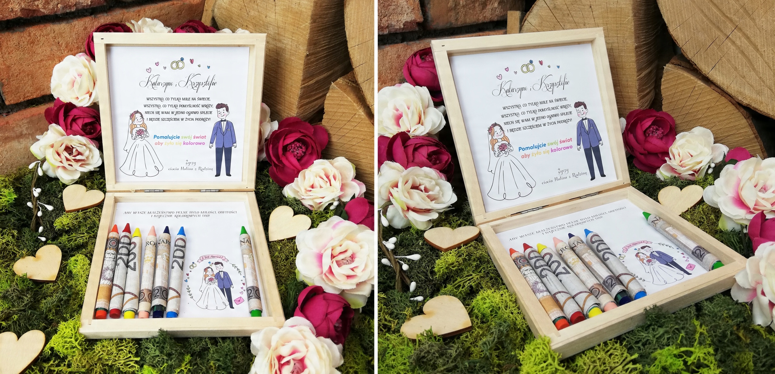 ДЕРЕВЯННАЯ КОПИЛКА - УКРАШЕННАЯ ПРИНТОМ СНАРУЖИ И ПОЖЕЛАНИЯМИ ВНУТРИ - ОРИГИНАЛЬНЫЙ СУВЕНИР ДЛЯ НОВОЙ ПАРЫ + ЦВЕТНЫЕ МЕЛКИ ДЛЯ ОБЕРТЫВАНИЯ БАНКНОТ