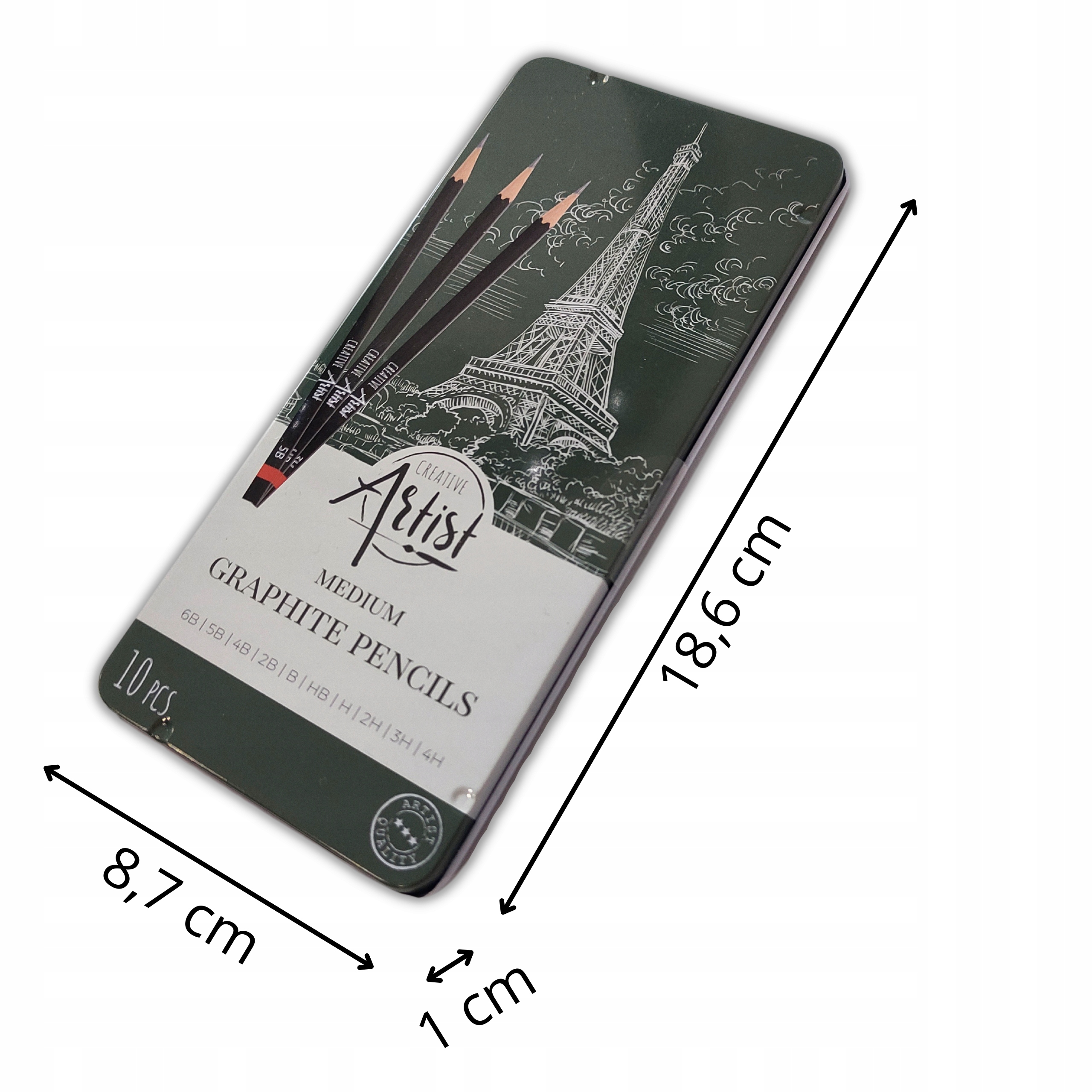 В упаковке целых 10 карандашей разной твердости: B, H и HB. Все это в прочном, красивом, металлическом ящике.