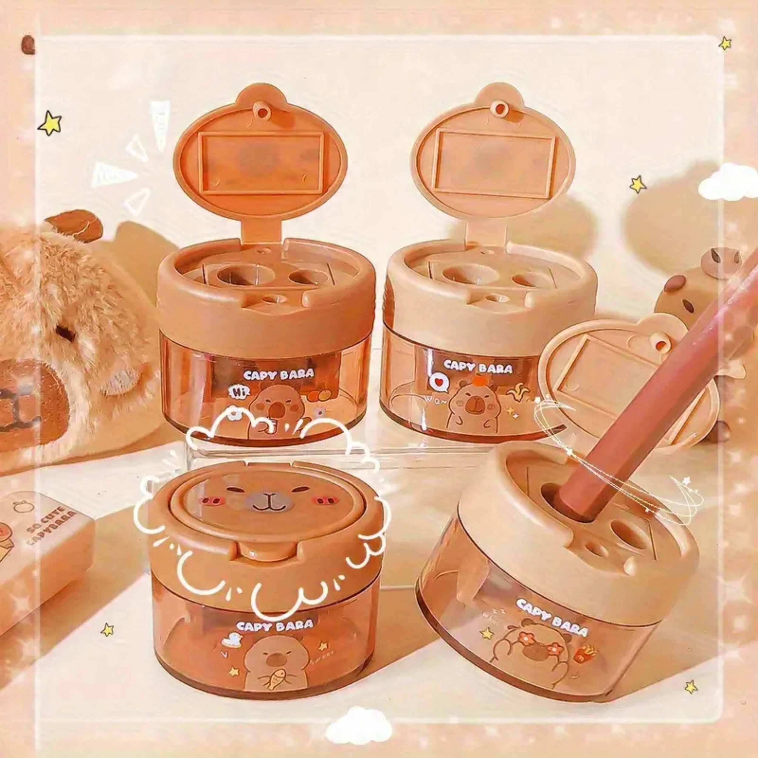 Очаровательный кладку с контейнером с мотивом капитализации оснащен двумя отверстиями заточки , которые позволяют температуре карандашей и карандашами различной толщины, а прозрачный контейнер позволяет вам контролировать уровень фишек и поддерживать порядок. Открытая крышка защищает от разлива содержания, и целое украшено сладкими иллюстрациями Капибара.
