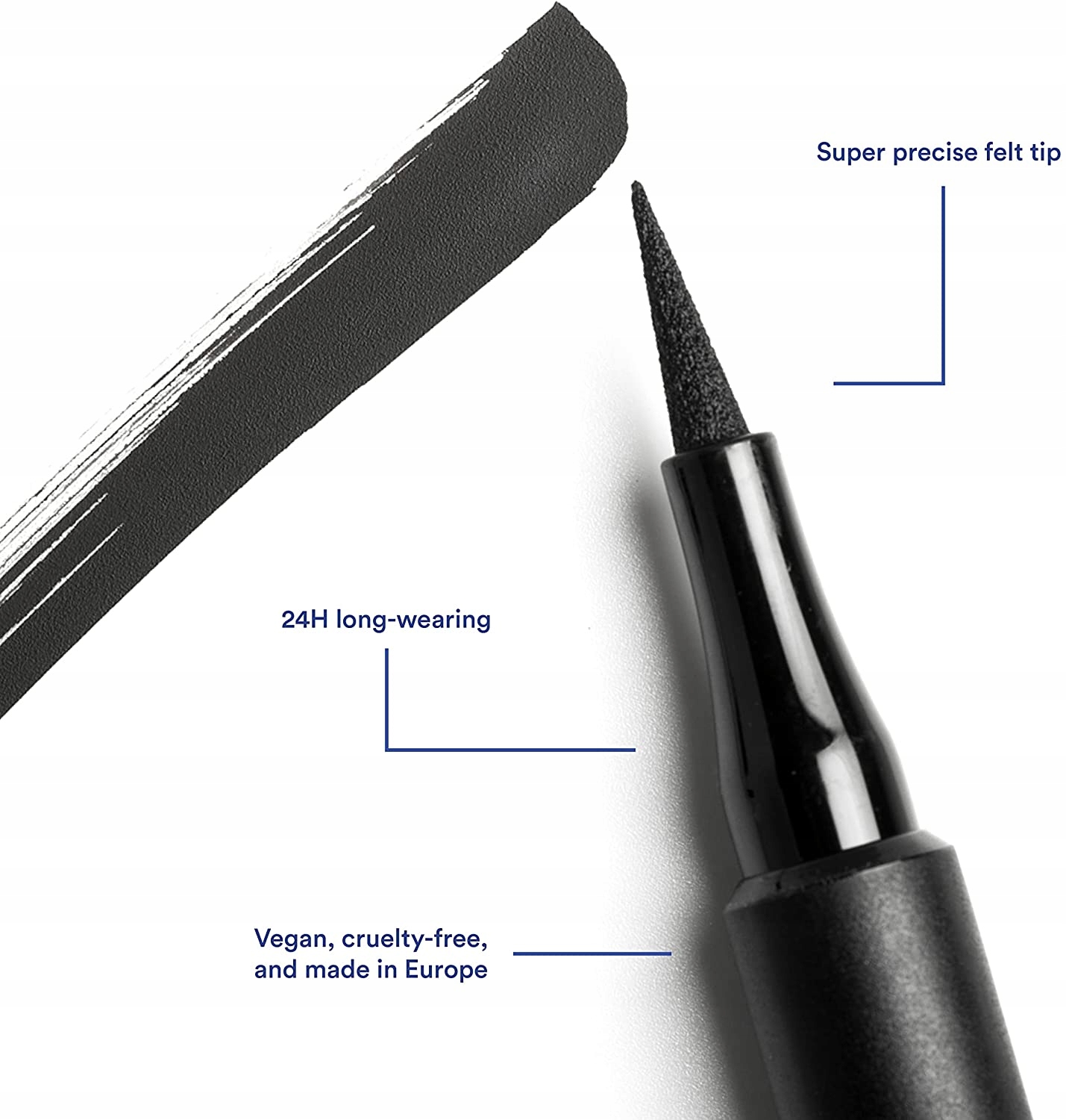 - МИНИМАЛЬНЫЙ МАКИЯЖ ЗА СЕКУНДУ – Для получения точного эффекта нанесите подводку на линию роста ресниц и проведите горизонтальную линию. Создавайте точные линии и креативные образы в мгновение ока.