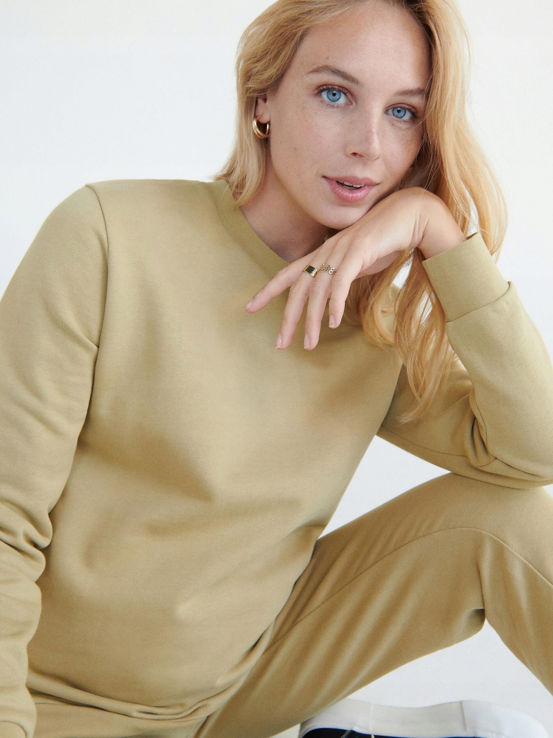 ОЛИВКОВАЯ СВИТШОТ ДЛЯ МАТЕРИАЛОВ С ДЛИННЫМ РУКАВОМ, ГЛАДКАЯ, СВОБОДНАЯ, С КРУГЛЫМ ВЫРЕЗОМ, M