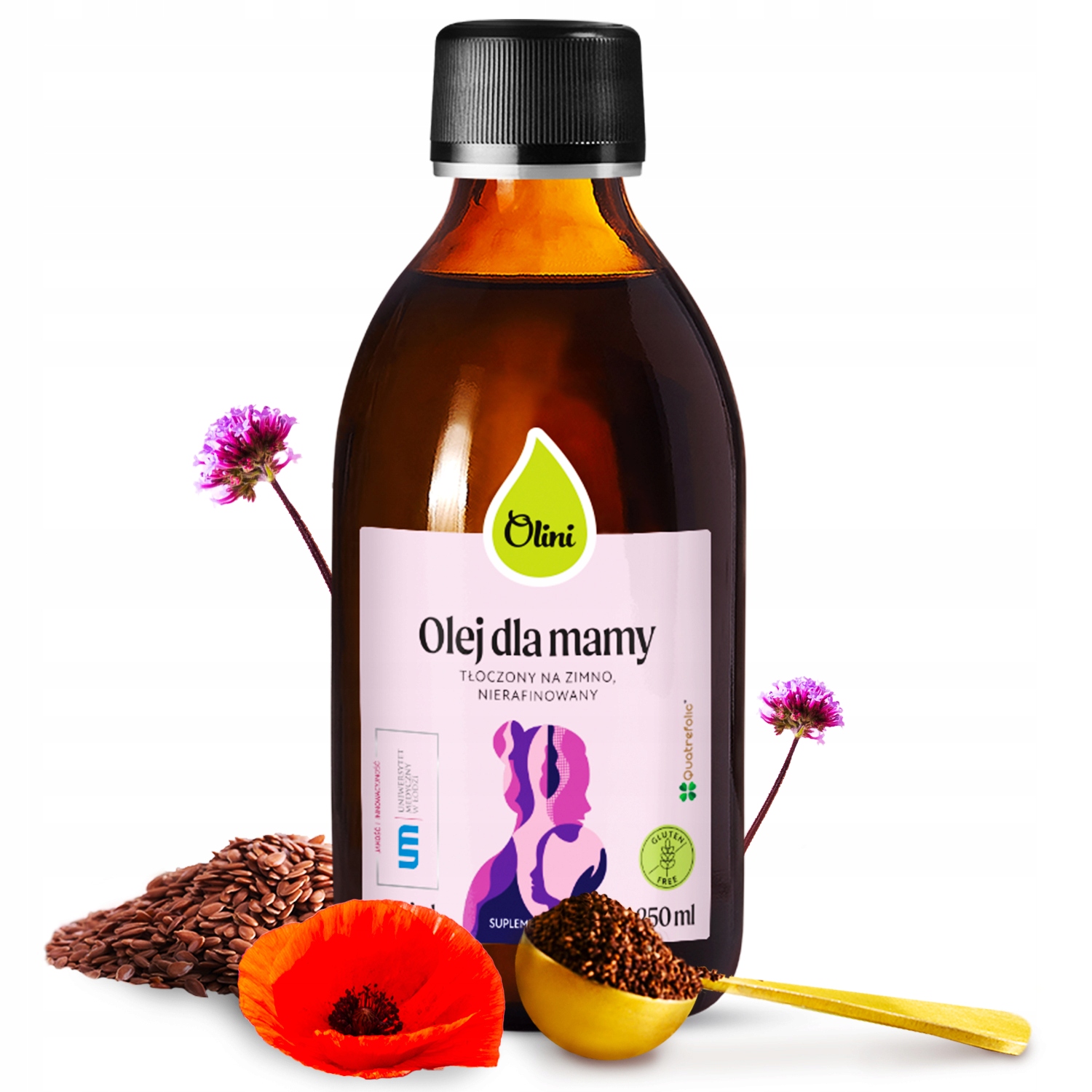 Материнское масло олини содержит 5000 мкг активной фолиевой кислоты Quatrefolic®. Это также источник ненасыщенных жирных кислот омега-3 и омега-6. Это подтверждают исследования, проведенные Медицинским университетом Лодзи.