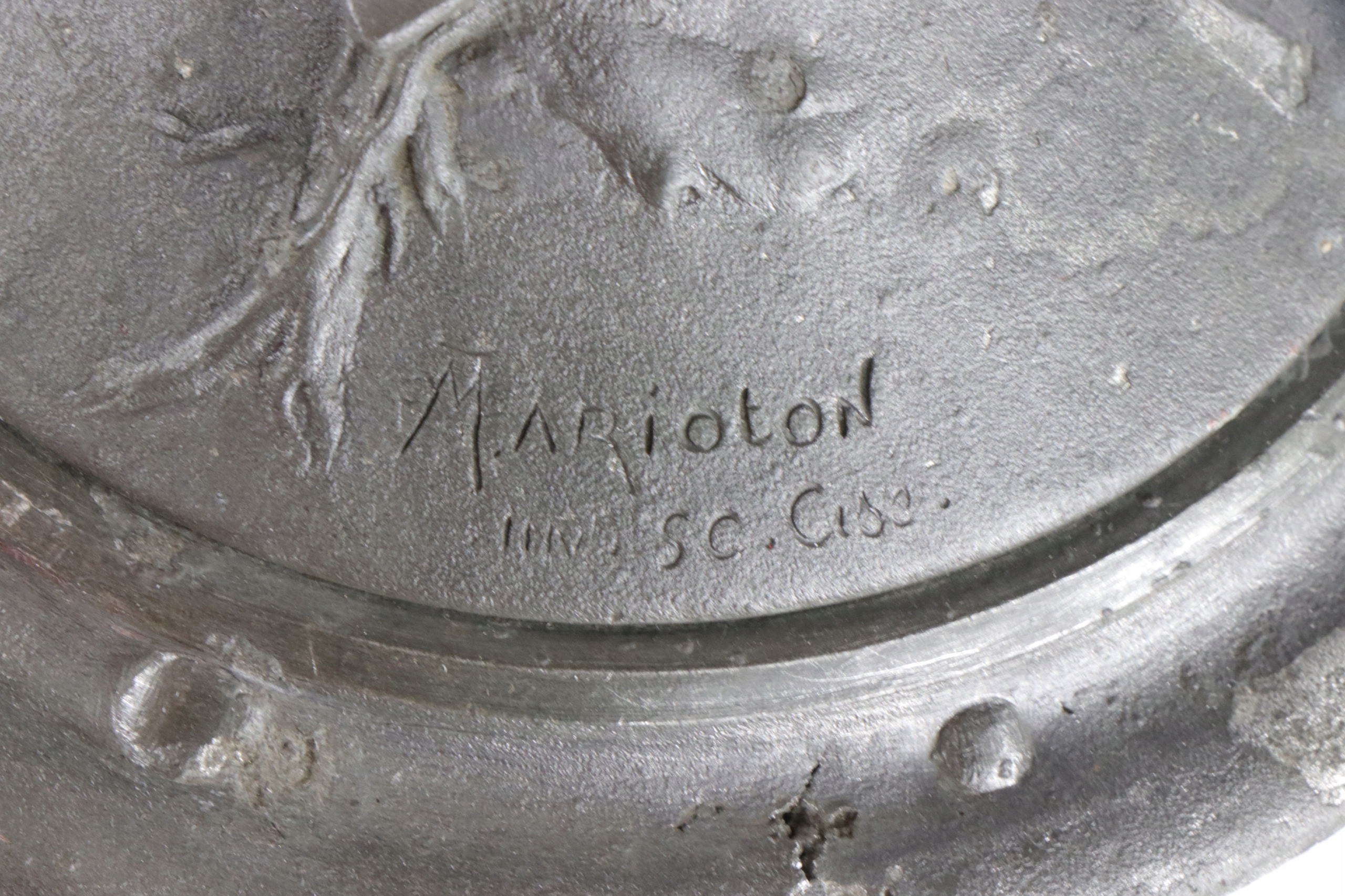Оловянная масляная лампа, переделанная в электрическую лампу. Подписан Мариотон на базе. Эжен Мариотон 1854 1925 Французский скульптор, медалист. Поверхность светильника украшена красивым рельефным орнаментом.