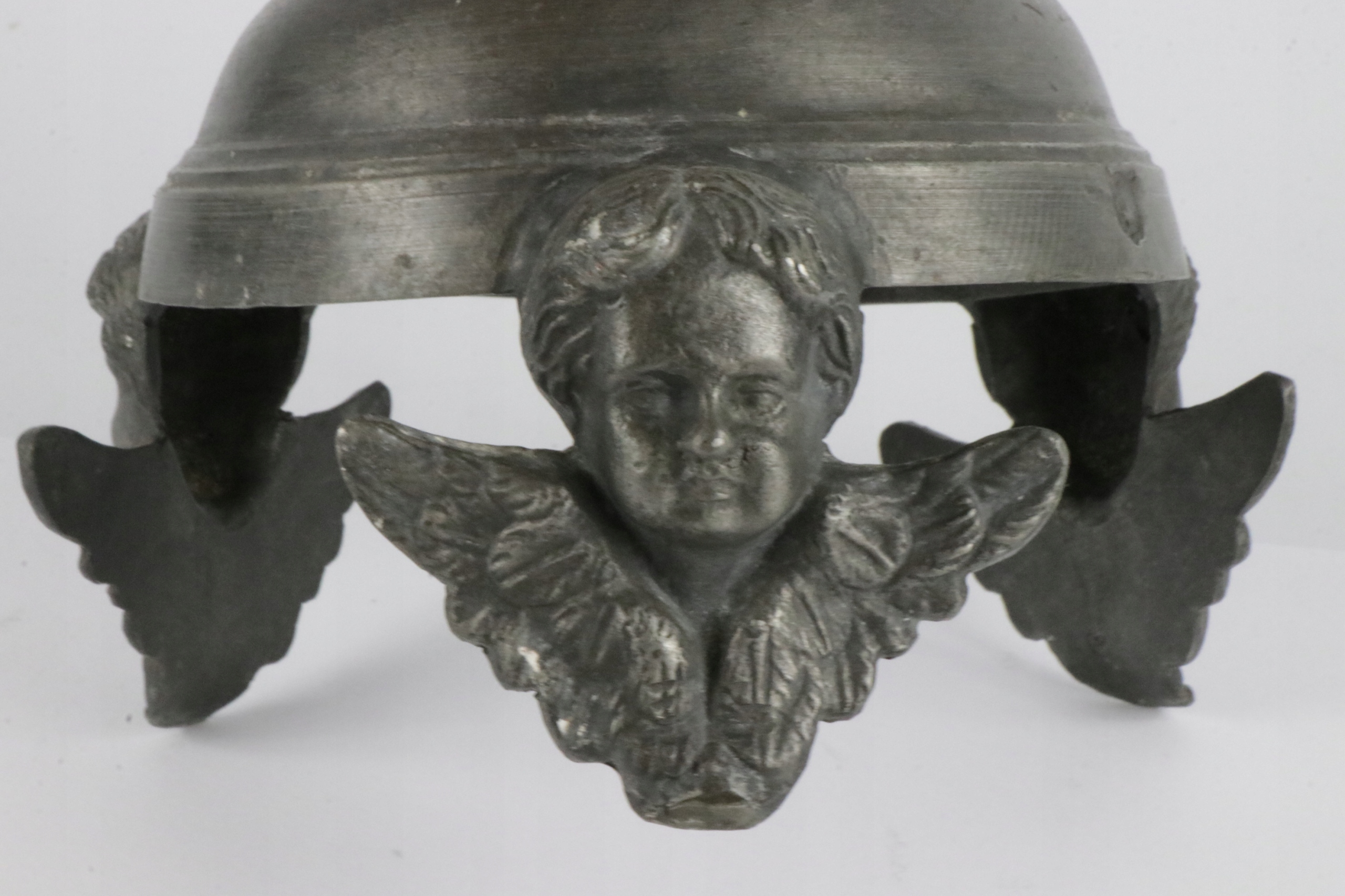 Жестяной церковный подсвечник в стиле барокко. Подсвечник на ножках, стилизованных под ангелов, вдохновленных картинами Рафаэля. Старая банка с подписью, видна сбоку на подсвечнике.