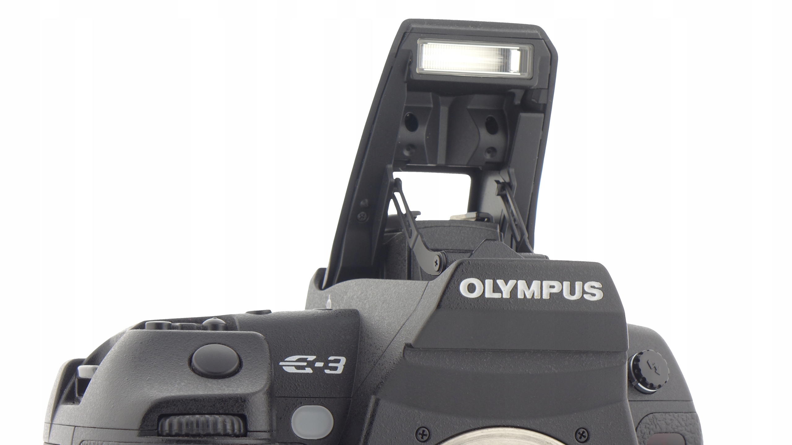 У E-3 появилось несколько новых функций, в том числе полноэкранный режим с шарнирным просмотром в реальном времени, автофокусировка в режиме просмотра в реальном времени, возможность захвата сцены с широким динамическим диапазоном с использованием метода обработки изображения, называемого технологией регулировки теней, а также возможность управления до трех беспроводных групп вспышек без внешних передатчиков. Камера также полностью защищена от атмосферных воздействий, даже когда выдвижная вспышка находится в верхнем положении.