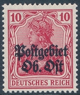 чистая марка без подложки и следов ее, типа Germania Mi.86 II, темно-красная с черным полуглянцевым шрифтом с синими отблесками «Post-gebiet./ Ob.Ost». . Марка в каталоге Fischer VOLUME II ed.2024 ON 21 e, в каталоге Michel Mi.5 c, гарантия компании Анджей Бартох PDF - Польский Филателистический Дом