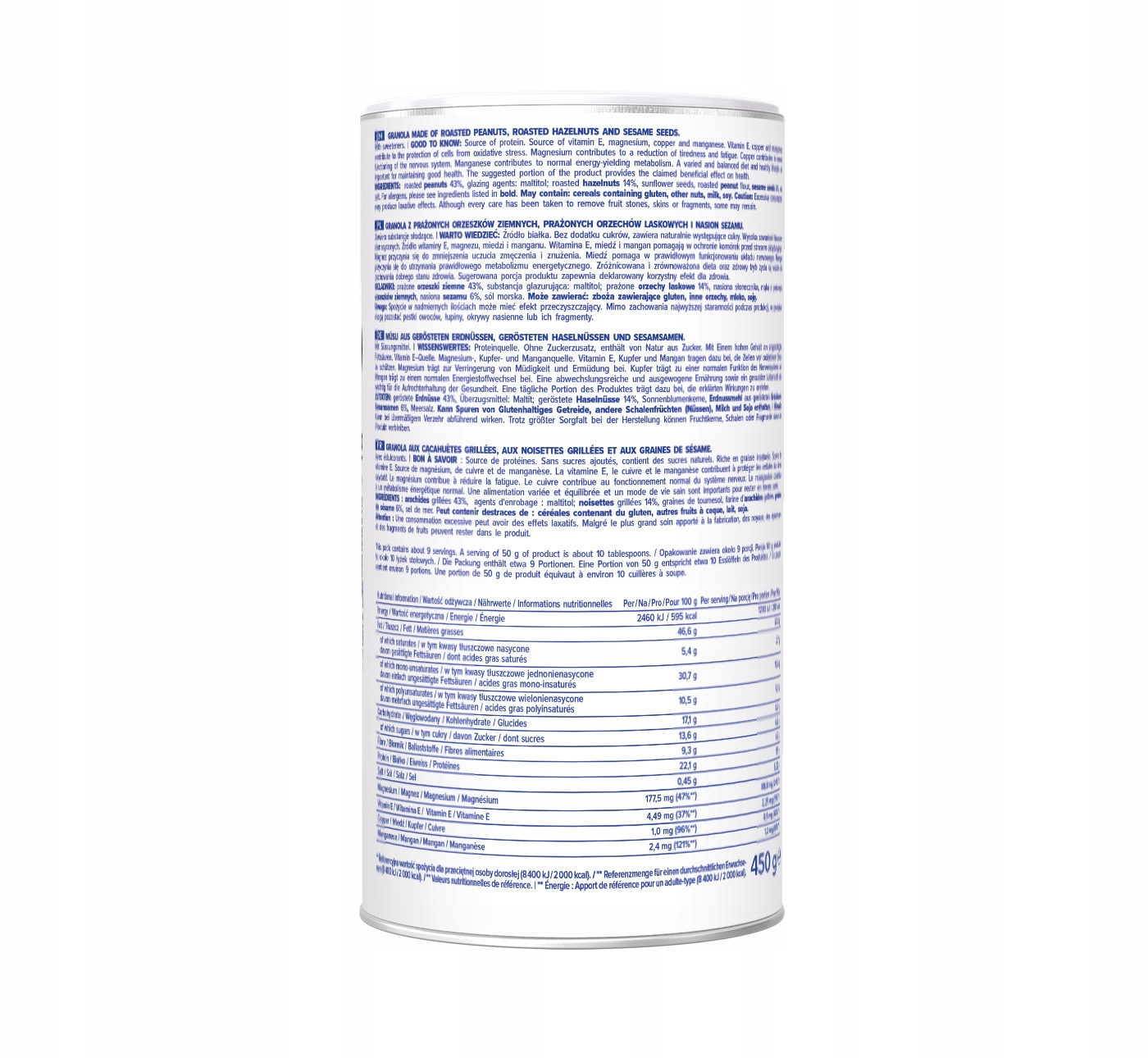 Жареный арахис 43%, глазирующий агент: мальтитол; жареный фундук 14%, семена подсолнечника, жареная арахисовая мука, семена кунжута 6%, морская соль.