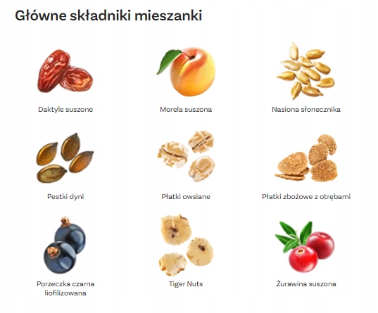 Состав: хлопья овсяные 42%, семена подсолнечника, курага (абрикосы, рисовая мука), финики сушеные (финики, рисовая мука), хлопья зерновые с отрубями ( Зерно пшеничное, отруби пшеничные, тростниковый сахар, солодовый экстракт ячмень, морская соль), хлопья миндаля молотые (тигровые орехи) 6%, клюква сушеная (клюква, тростниковый сахар, подсолнечное масло), семена тыквы, смородина черная сублимированная 1,7%.