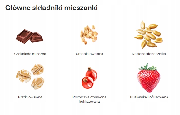 Сердечно -сосудистая система работает лучше, поддерживая часть необходимых ингредиентов каждый день, а низкое содержание соли облегчает сохранение диетыхлопья овсяна 57%, гранола oat (овсянка , сироп даты [100%даты], волокно корня цикория, семена подсолнечника, рисовая мука), молочный шоколад 10%(сахар, полное порошковое молоко Какао, эмульгатор: подсолнечные лецитины), поджаренные хлопья ячмень , замораживаемая клубника 3,3%, замораживаемая, красная смородина.