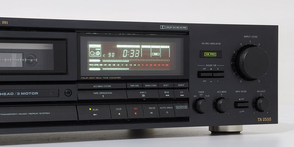 Палуба 3 головы, с того периода, когда магнитофон пережил свой золотой период. Отличный звук, яркий и пространственный с теплым аналоговым цветом. Красивый захватывающий дисплей с большим количеством информации, он отлично смотрится ночью. Полностью микропроцессорная механика. Те, кто заинтересован, знают, что это за оборудование, одна из ведущих палуб в аналоговом мире. Производительность на самом высоком уровне. Это принадлежит ценной серии Integra. Оборудование очень массивное - ни один усилитель не мог завидовать. TA-2550 имеет твердую основу, передняя часть изготовлена из красивого алюминия