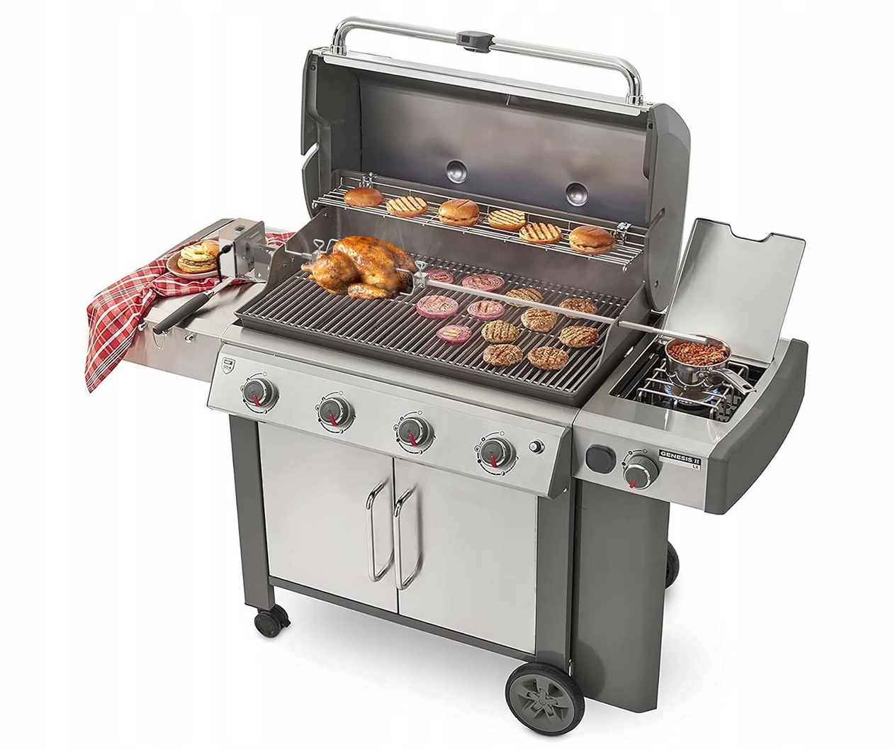 - Прочный гриль из нержавеющей стали, способный обрабатывать целое мясо. или большую жареную курицу.