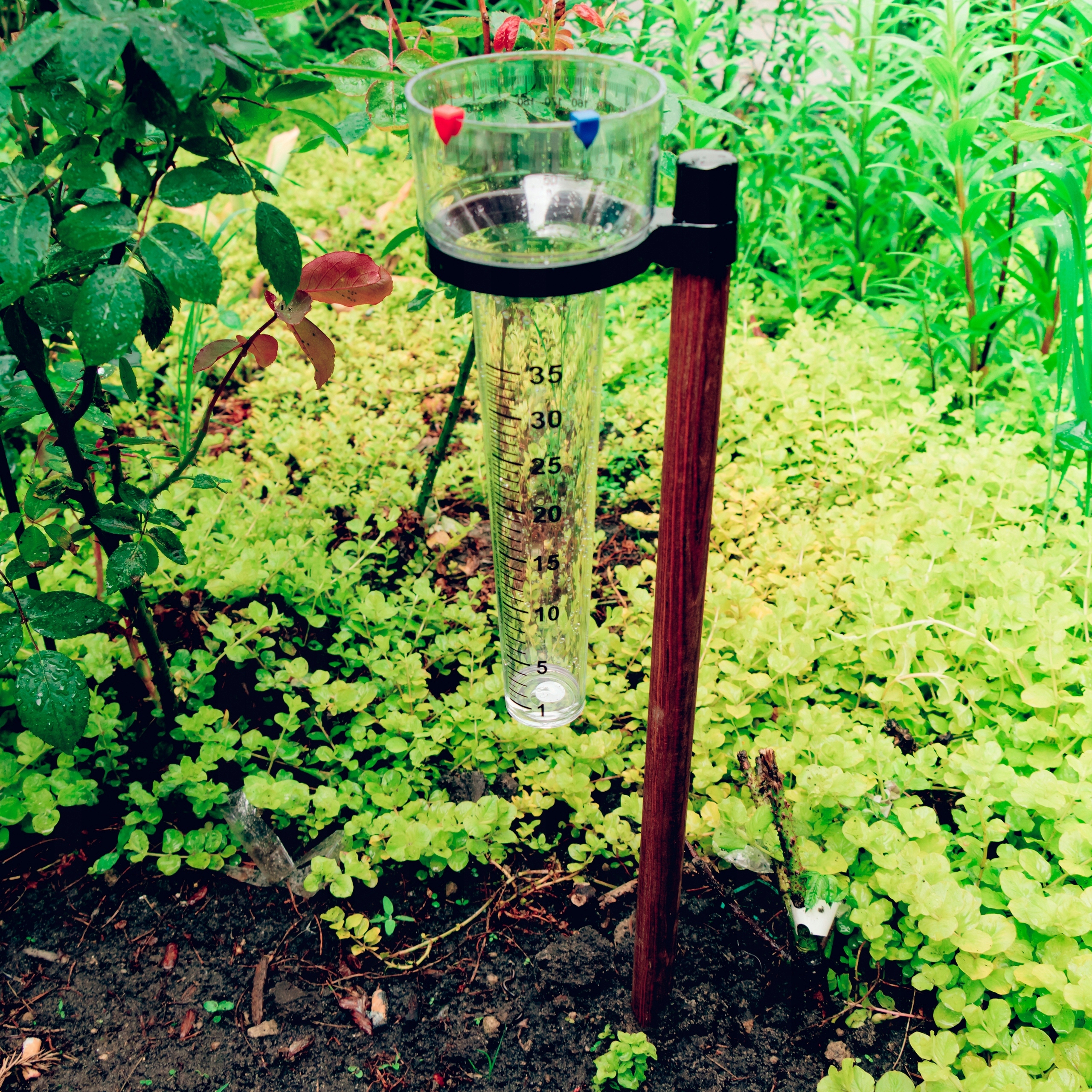 После считывания количества осадков (по вертикальной шкале) переместите цветной индикатор по горизонтальной шкале на количество строк, указанное чтение. После разметки слейте воду.