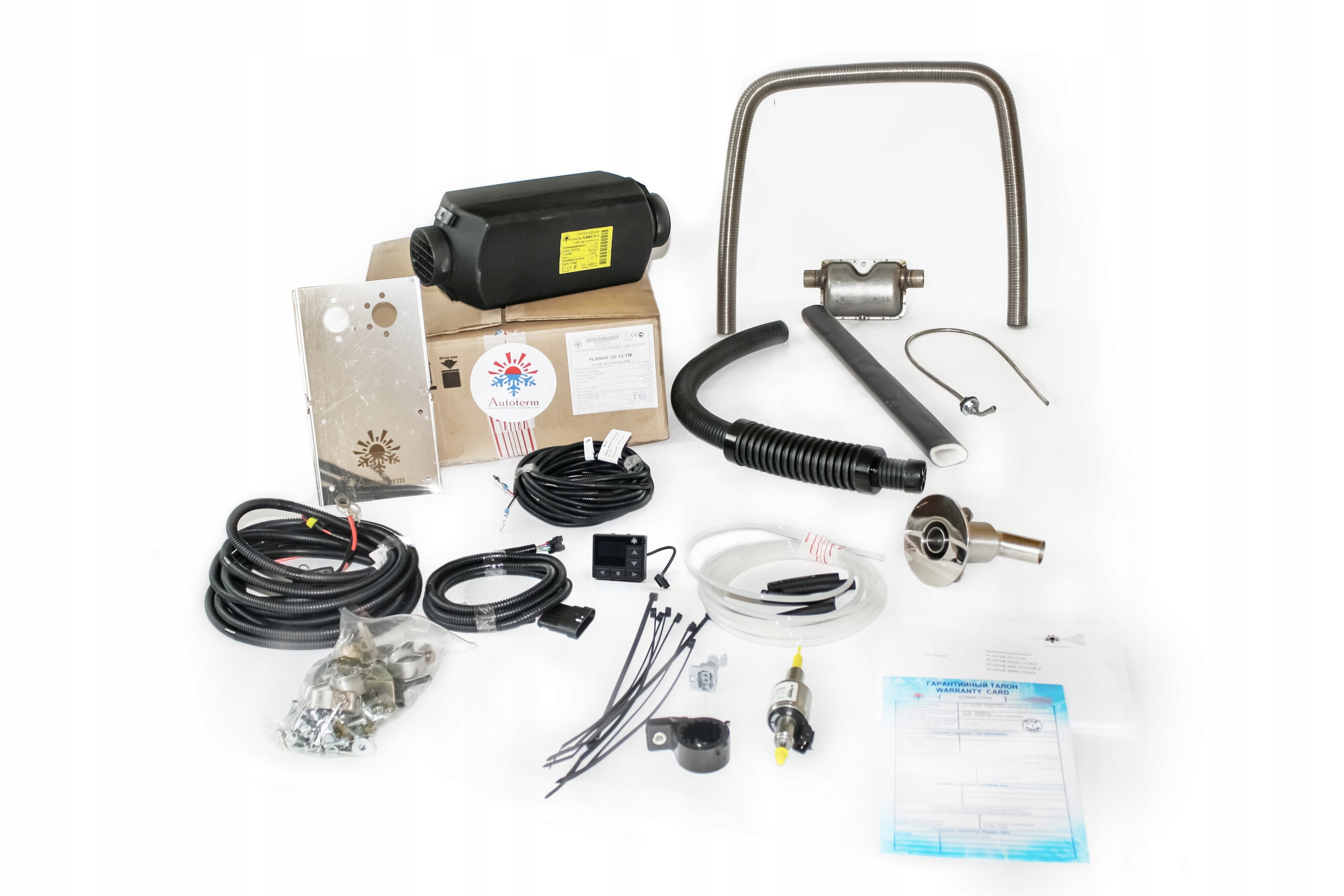 которая уже включает в себя отопитель, впускную трубу с фильтром, трубу выхлопных газов fi24, кабели, бесшумный топливный насос со встроенным фильтром, глушитель, полиамидную топливную трубку, ручки, хомуты и крепежные ремни.