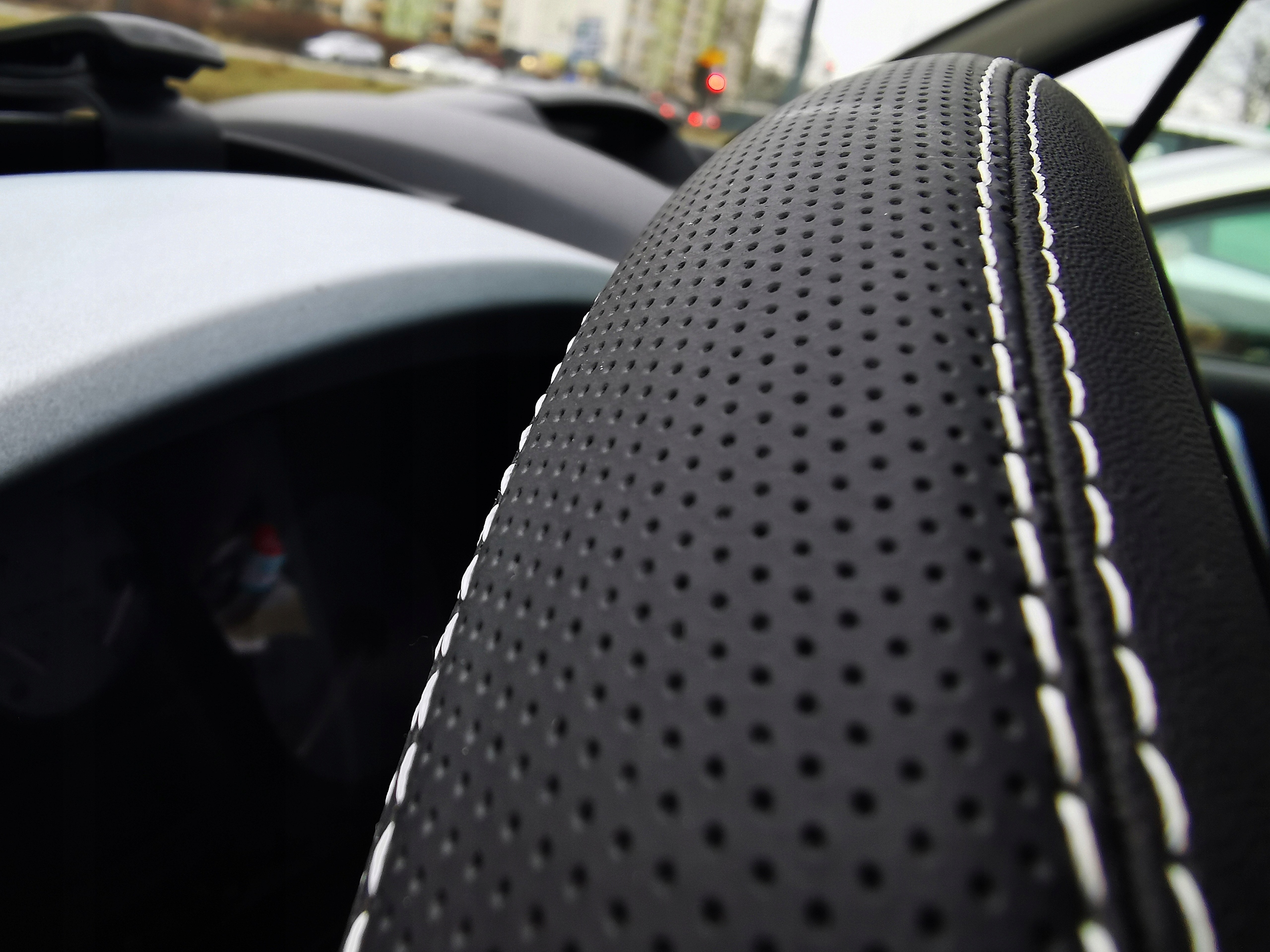 Чехол на руль из высококачественной перфорированной экокожи в сочетании с гладкой экокожей.