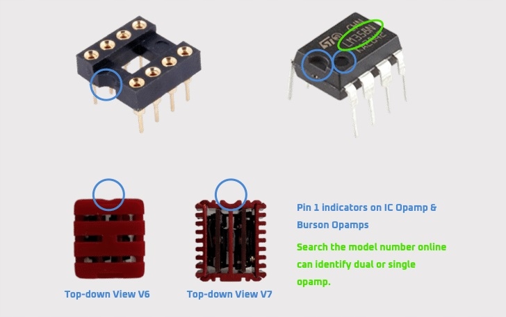 Чтобы проверить совместимость устройства с Supreme Sound V7, начните с определения типа операционного усилителя (двойной или одинарный) для 8-контактного DIP-разъема и его правильной ориентации.