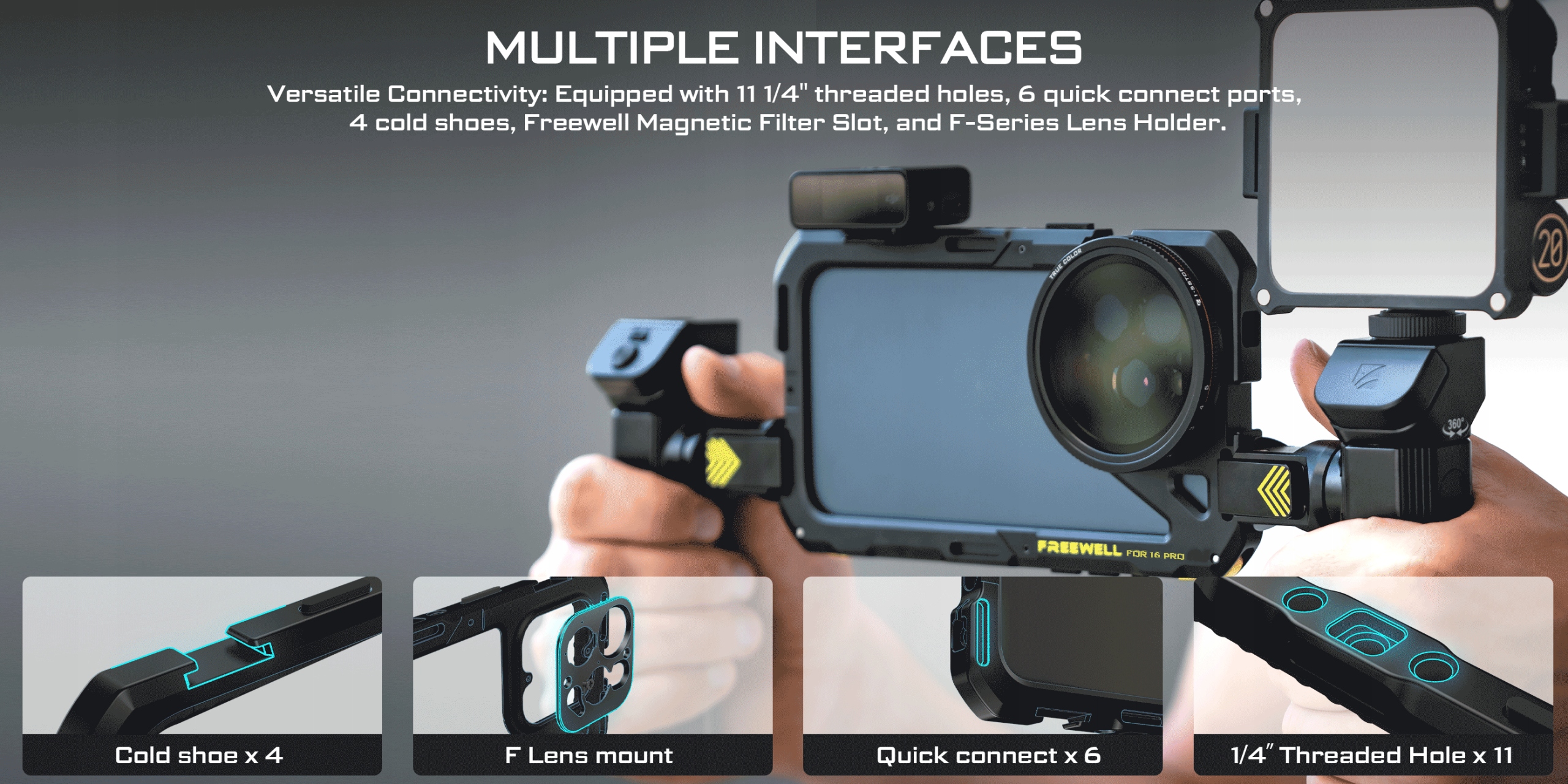 Оператор Genius Rigator от Freewell открывает множество новых возможностей для настройки идеальной фотографической и пленки с использованием Apple iPhone 16 Pro. Базой всего набора представляет собой алюминиевую клетку для смартфона с креплением для фотофильтров и замену штыка, который позволяет прикреплять линзы или объективы Freewell F-серии с 17-миллиметровыми потоками в линейке Freewell и других брендах (F-Series линзы, 17 мм и заменить 17 мм штыки отдельно). В клетке есть холодные и фото -нить 1/4 "внизу и боковые стороны.