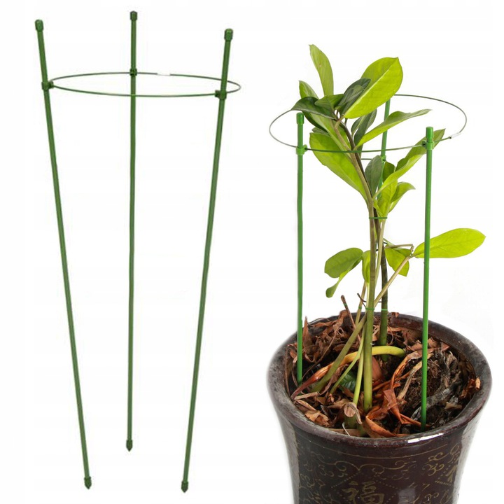 Кольцевая опора со столбиками — отличный вариант для горшечных растений и клумб. Благодаря прочной металлической конструкции и пластиковому покрытию он очень устойчив к повреждениям и неблагоприятным погодным условиям, а благодаря зеленому цвету становится практически незаметным на фоне растения. Полезно, среди прочего: при выращивании: черника, гортензии. Он не дает растению «лежать» и позволяет ему гармонично расти. Кольцевая опора может стать интересной альтернативой различным типам одиночных опор. Зеленый цвет изделия прекрасно сочетается с растениями, а также служит украшением сада. Опору следует разместить в земле рядом с растением и подвязать к ней стебель, это обеспечит отличную стабилизацию и защиту от разрушения даже в ветреную погоду.