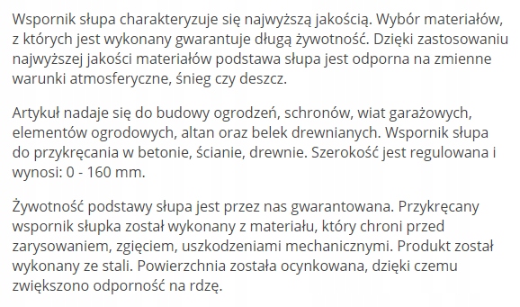 Просматривая «ОПОРА ОСНОВИ СТІБКИ З ЯКОРНИМ ОСНОВОМ 0-160 ММ», вы можете быть уверены, что данный товар из каталога «Беседки, навесы, навесы» будет доставлен из Польши и проверен на целостность. В цене товара, указанной на сайте, учтена доставка из Польши. Внимание!!! Товары для Евросоюза, согласно законодательству стран Евросоюза, могут отличаться упаковкой или наполнением.