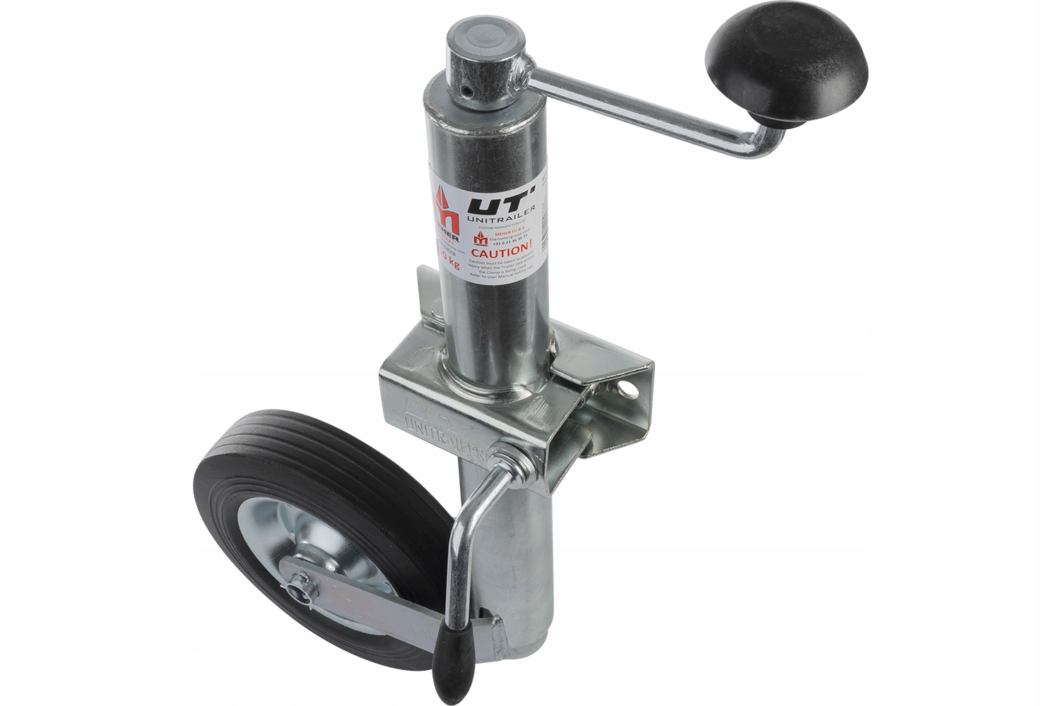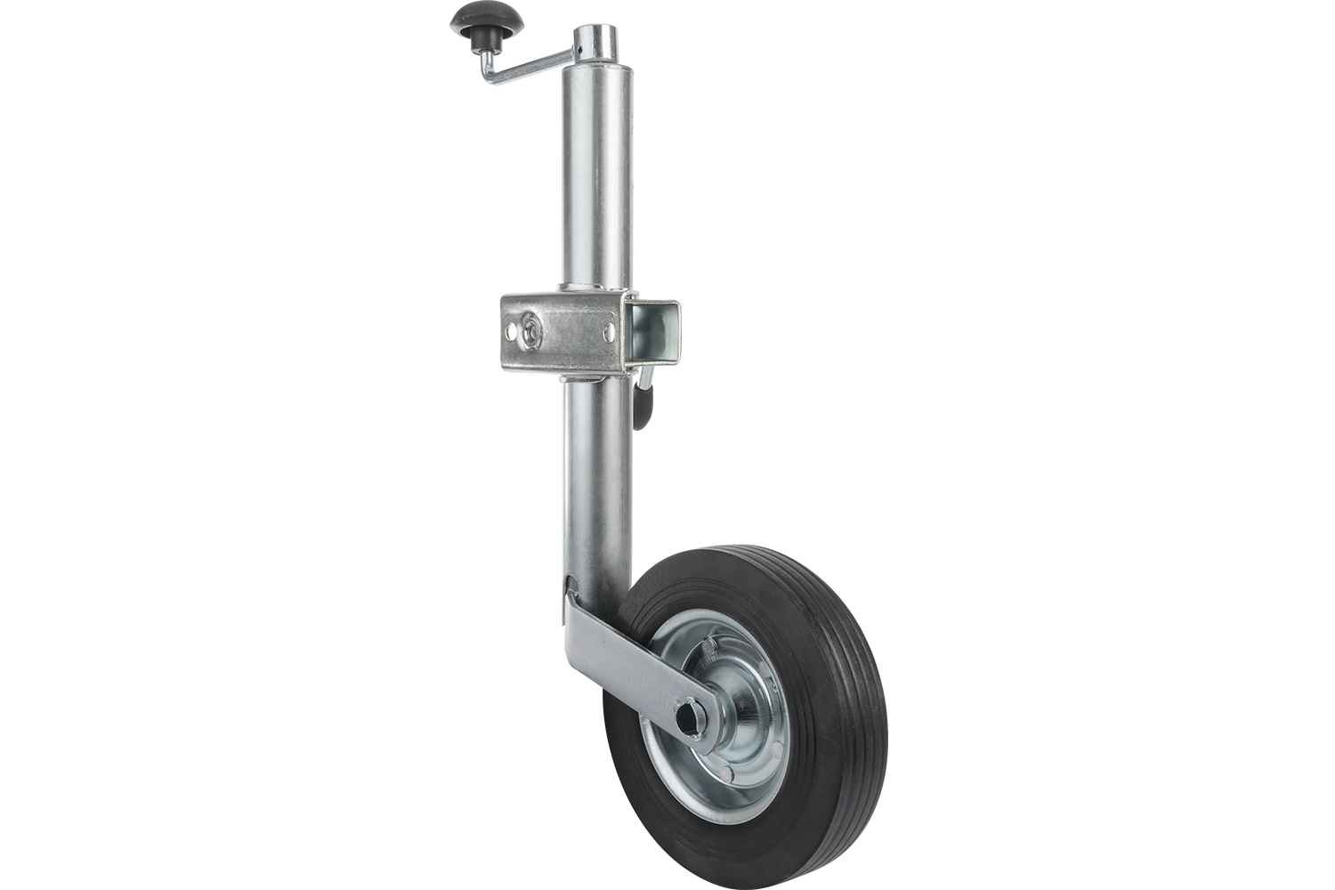 Стальное опорное колесо прицепа входит в комплект совместимого зажима для прицепа Unitrailer. Диаметр трубы 48 мм.