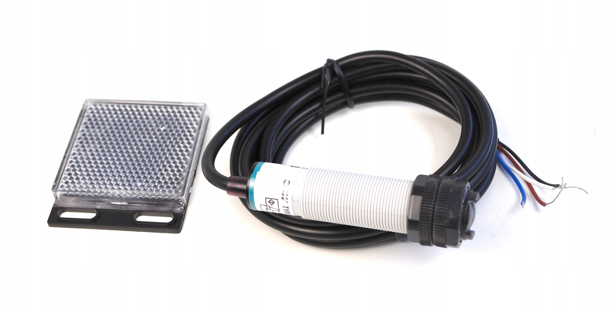 Фотоэлектрический датчик G18-3B2PC. Он обнаруживает присутствие объекта, когда он пересекает луч света, отраженный от зеркала. Максимальная дальность действия — 100 см.