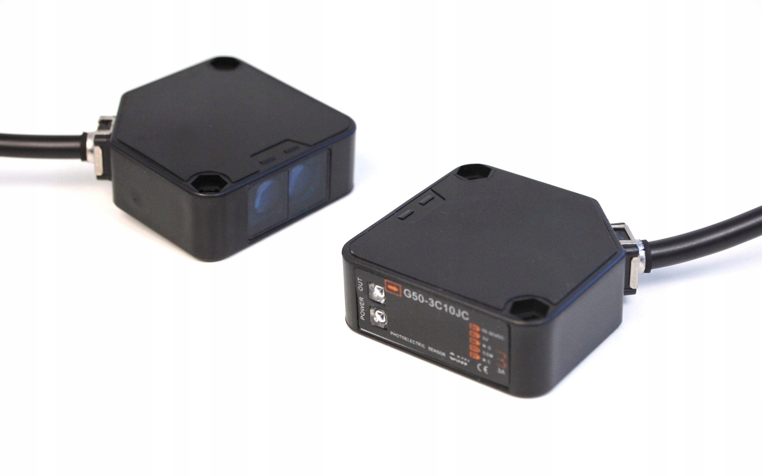 Фотоэлектрический датчик G50-3C10JC. Передатчик посылает световой луч на приемник. Объект обнаруживается путем разрезания этого луча. Максимальная дальность действия составляет 10 м.
