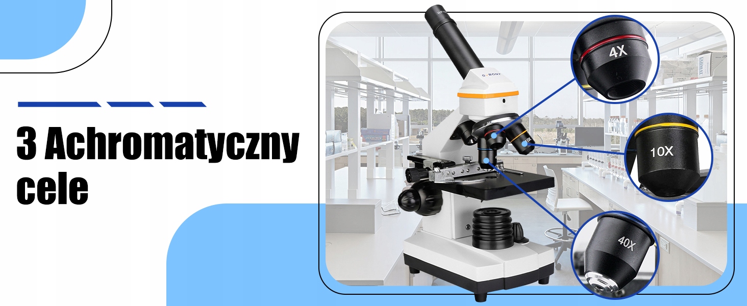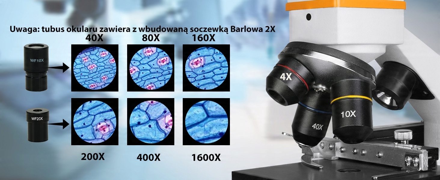- Настройка увеличения; вращающиеся ахроматические объективы 4x 10x и S40x с окулярами WF10X WF20X; со встроенной линзой Барлоу 2,0Х; дать оптическому микроскопу увеличение 40-1600 раз; Идеально подходит для просмотра клеточных структур и микроорганизмов.
