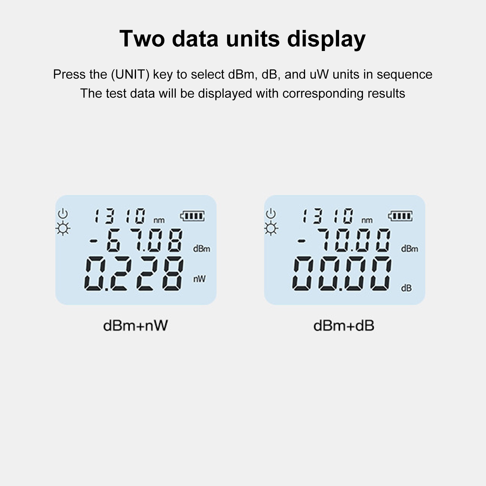 5. Отображаются два типа единиц данных: нажмите кнопку (единица измерения) на тестере оптоволоконного кабеля, чтобы поочередно выбрать единицы измерения DBM, DB и UW, и тестовые данные будут отображены с соответствующими результатами.