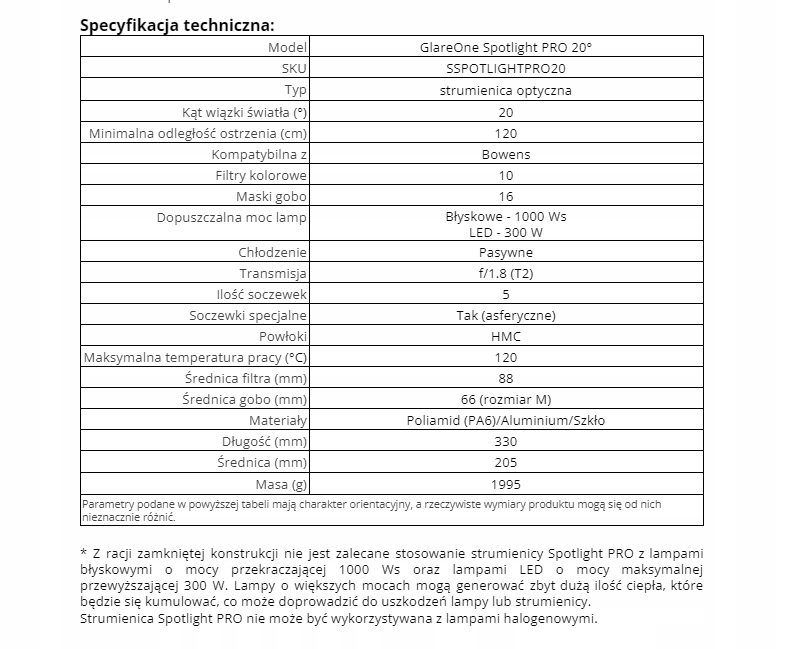 GlareOne Spotlight PRO 20° — профессиональный оптический прожектор, предназначенный для работы со светодиодными лампами максимальной мощностью 300 Вт или с лампами-вспышками до 1000 Вт. Имеет встроенную линзу с углом освещения 20 градусов и клапаны, позволяющие формировать световой поток. Комплектуется набором из 10 цветных фильтров, 16 масками эффектов (гобо) и сумкой для транспортировки.