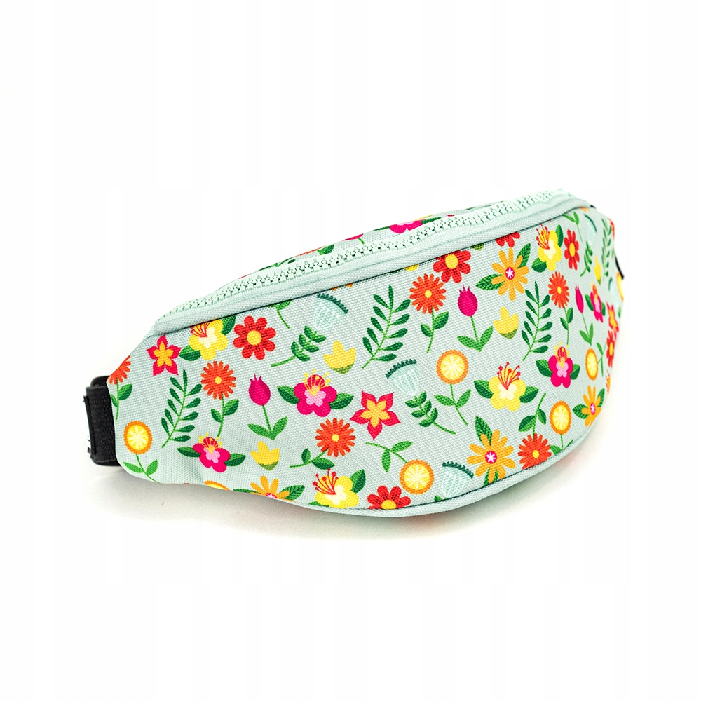 Детская и подростковая набедренная сумка с яркими цветами на мятном фоне.