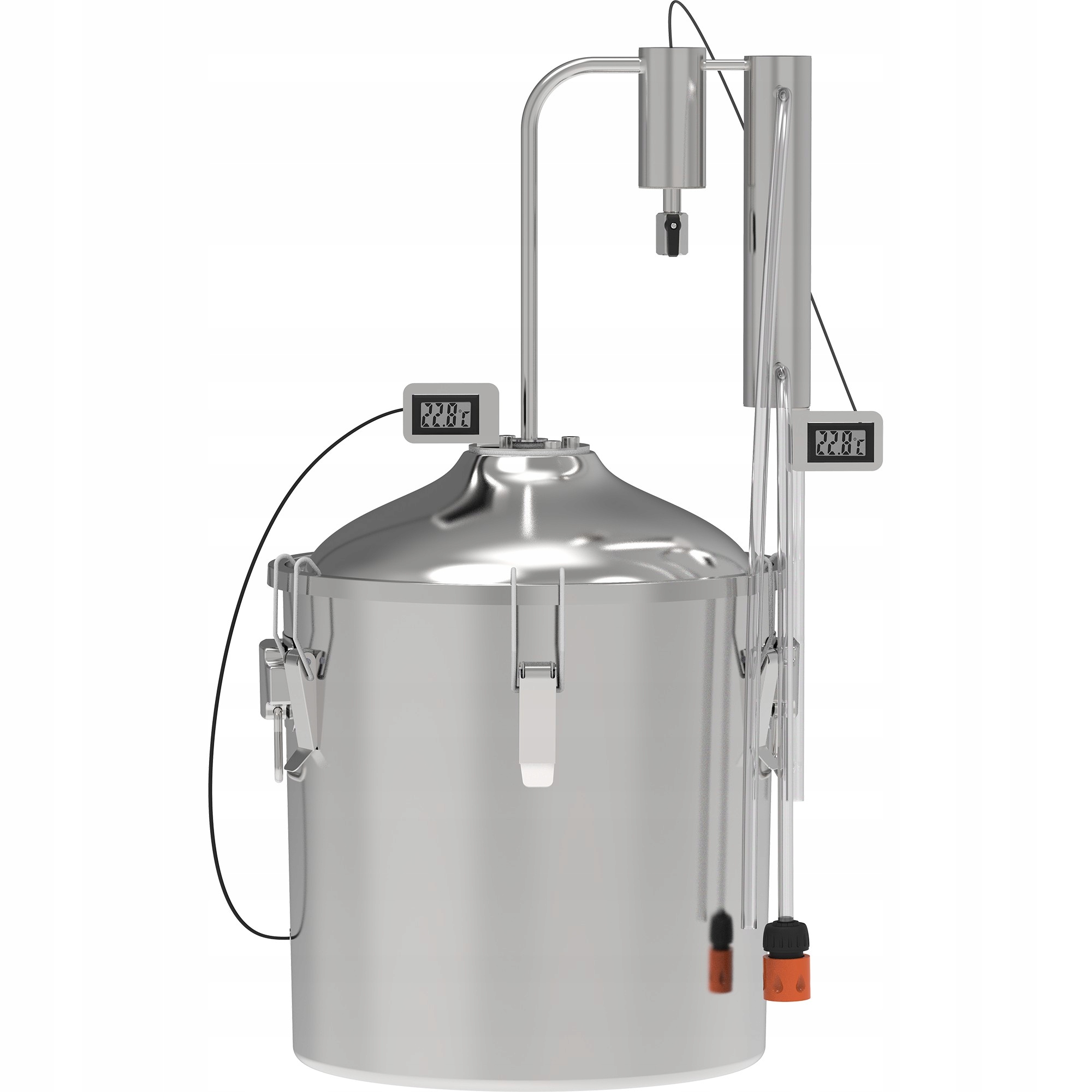 Дистиллятор оснащен 30-литровым контейнером (с рекомендуемым заполнением до 90%емкости, не менее 25%), не менее 25%), не менее 25%), охладителем радиатора и 2 термометрам, что позволяет дистилляции без какого-либо дополнительного оборудования. Набор подходит для использования на различных источниках тепла. Два точных термометра с датчиками облегчают контроль температуры - внутри контейнера и в выступающем. Игольщик с разъемом позволяет легко подключить водоснабжение и дренаж. Силиконовый шланг используется для получения дистиллята.