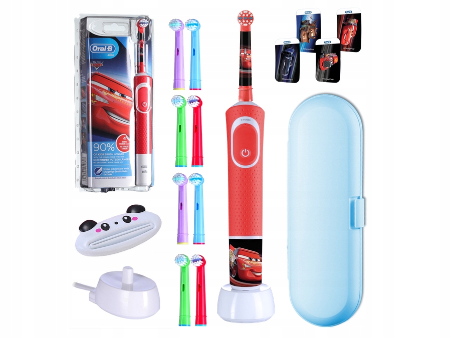 - В комплект входят: электрическая зубная щетка со встроенным аккумулятором, подставка для зарядки (зарядное устройство), 1 оригинальная насадка в комплекте от производителя , 8 насадок, запчасти для детей, футляр для зубной щетки, 4 разные наклейки из мультфильма ТАЧКИ, выдавливатель для зубной пасты, оригинальная упаковка и инструкция по эксплуатации.