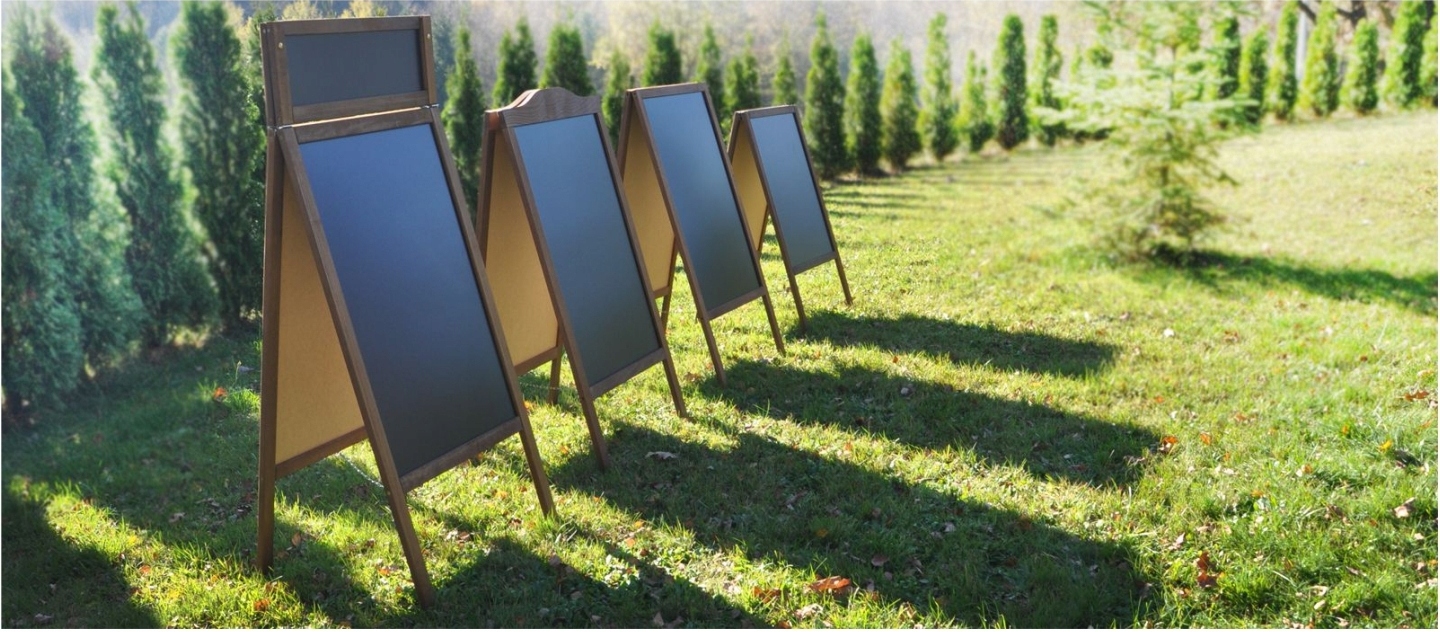 Черные доски для письма расположены по обеим сторонам доски. Благодаря этому у вас появляется в два раза больше рекламной площади и ваше предложение смогут увидеть все прохожие. Доски для письма изготовлены из деревянных плит HDF повышенной плотности. Это делает доски твердыми и долговечными. Писать на них можно обычным мелом или меловым маркером, что дает отличные результаты. Таблички с надписью легко и быстро моются слегка влажной тряпкой. С помощью доски вы сможете рекламировать дешевле и эффективнее, поскольку сможете изменить свое предложение в любой момент.