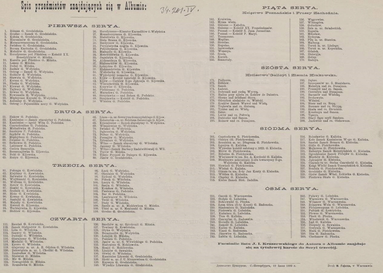 При жизни Наполеона Орды, в 1873 году, в составе альбома было издано восемь серий, содержащих 260 литографированных рисунков и акварелей, выбранных из 1027 выполненных автором. Из-за отсутствия средств остальные доски в комплект не вошли, так как издание финансировалось художником. Рисунки были перенесены на литографский камень Алоизом Мисеровичем, а отпечатки были сделаны в Литографической мастерской Максимилиана Фаянса в Варшаве в 1873–1883 годах.