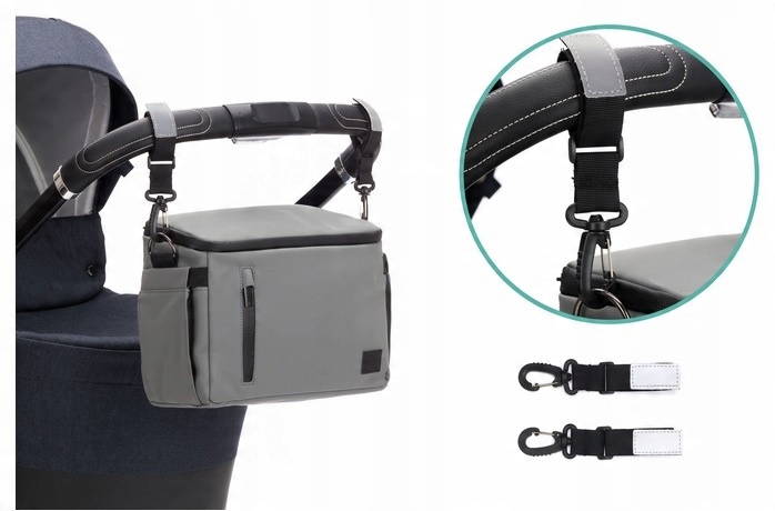 Входящие в комплект монтажные зажимы позволяют легко прикрепить его к ручке коляски или коляски.